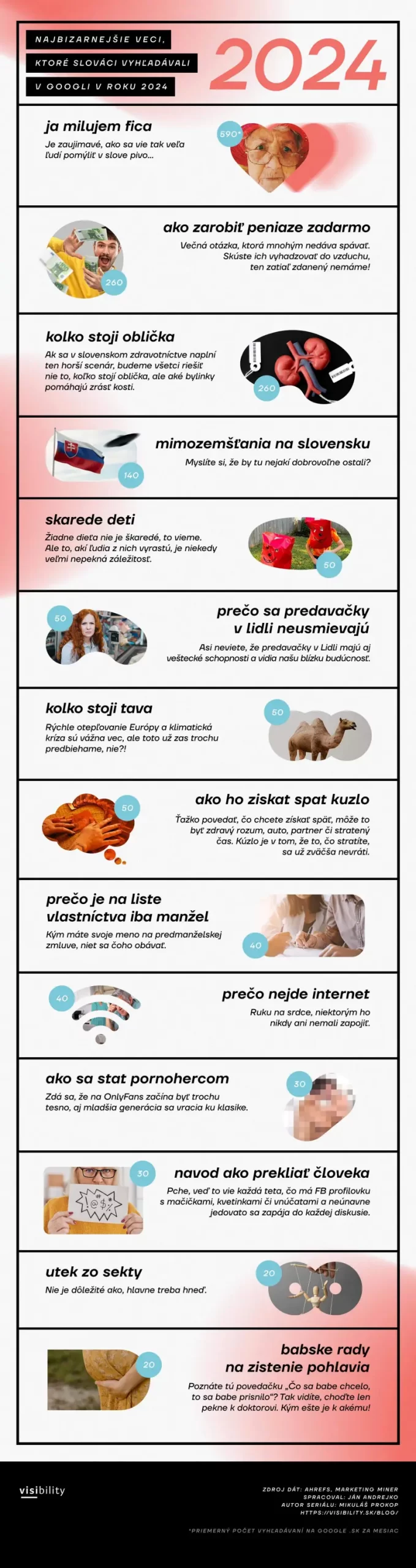 V niektorých prípadoch boli frázy skutočne vtipné a zaujímavé. Slovákov vo veľkom zaujímalo, ako zarobiť peniaze zadarmo, koľko stojí oblička, no aj prečo sa predavačky v Lidli neusmievajú. Nechýbala však ani otázka „prečo nejde internet?“, aj keď v tomto prípade je otázne, akým spôsobom ľudia túto otázku vyhľadávali. V infografike nižšie sa môžete pozrieť na najbizarnejšie výrazy, ktoré sa vo vyhľadávaní Googlu objavili. Pri daných výrazoch nájdete aj číselný údaj o tom, koľkokrát sa táto fráza vyhľadávala priemerne každý mesiac.