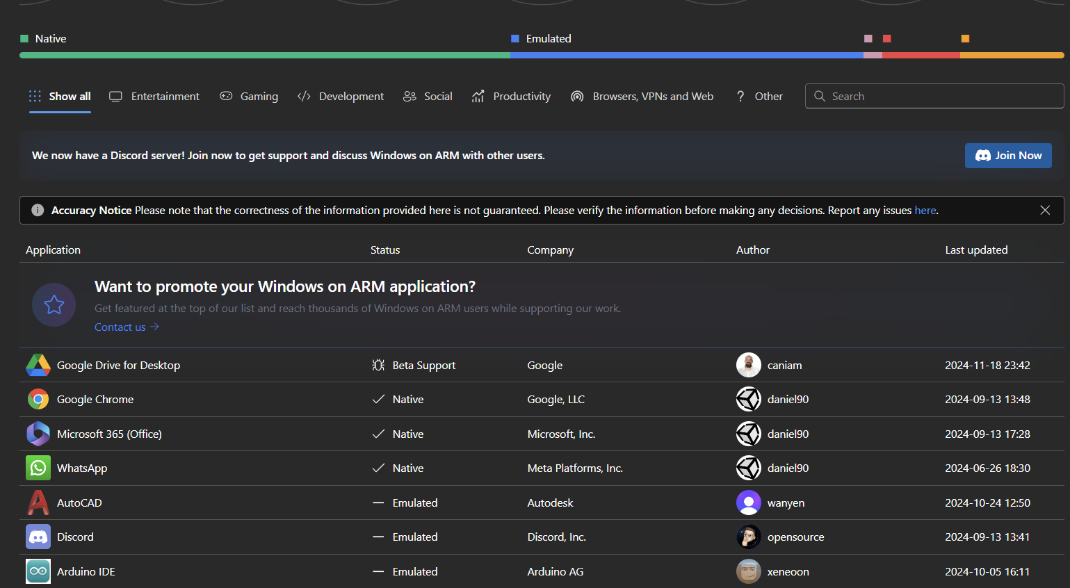 Na stránke Windows ARM sú aplikácie rozdelené do 5 kategórií. Ich zatriedenie je závislé od toho, či je daná aplikácia natívna pre arm alebo funguje v emulovanom režime, prípadne nefunguje vôbec.