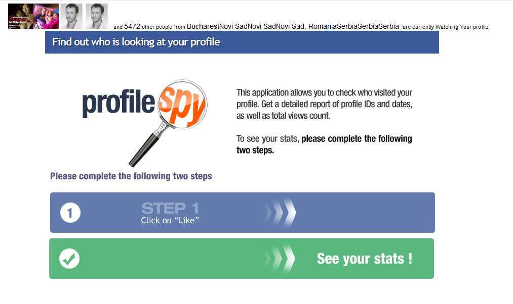 Ak vidíte nejakú reklamu na webovú stránku, službu alebo aplikáciu, ktorá umožňuje zistenie toho, kto si prezerá váš profil na Facebooku, VO VŠETKÝCH PRÍPADOCH IDE O PODVOD, KTORÝ SA VÁS SNAŽÍ OKRADNÚŤ ALEBO VÁM INFIKOVAŤ POČÍTAČ.