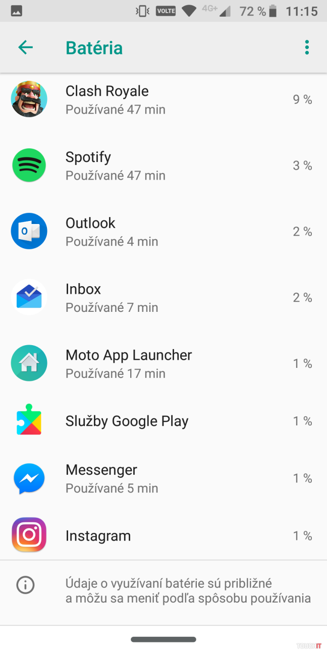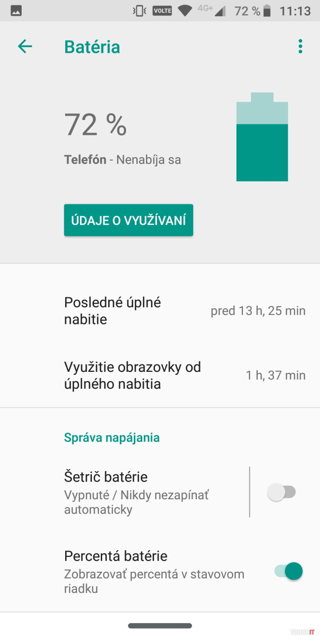 Extra tip: Pridajte si percentuálnu informáciu o kapacite do stavového riadku. Spravidla smartfóny s čistým Androidom nemajú percentuálnu informáciu o zostávajúcej kapacite batérie v hornom riadku systému. Dá sa aktivovať dodatočne práve z nastavení Batéria – Percentá batérie. Niektorí výrobcovia umožňujú tento percentuálny údaj zobrazovať priamo v ikone batérie. Vtedy ale zmizne približný grafický ukazovateľ zostávajúcej kapacity.