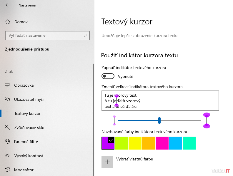 Teraz máte v časti Nastavenia – Zjednodušenie prístupu – Textový kurzor novú možnosť. Je ňom farebné zvýraznenie polohy kurzora. Samotný kurzor nebude mať inú farbu ale jeho horné a dolné ohraničenie sa dá zvýrazniť.