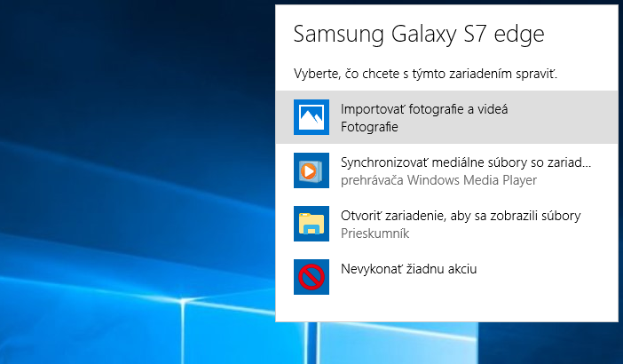 Ak naň kliknete, zobrazí sa okno s výberom možných akcií, pričom v základe ide o ponuku otvorenia v rámci Prieskumníka priečinkov, synchronizácie s Windows Media Playerom a importom do aplikácie Fotografie. V ponuke je takisto možnosť nevykonať nič. Ak toto okno ignorujete, objaví sa zakaždým, keď zariadenie k počítaču pripojíte. Ak ale v ňom nejakú možnosť kliknutím vyberiete, tak táto voľba sa zapamätá.