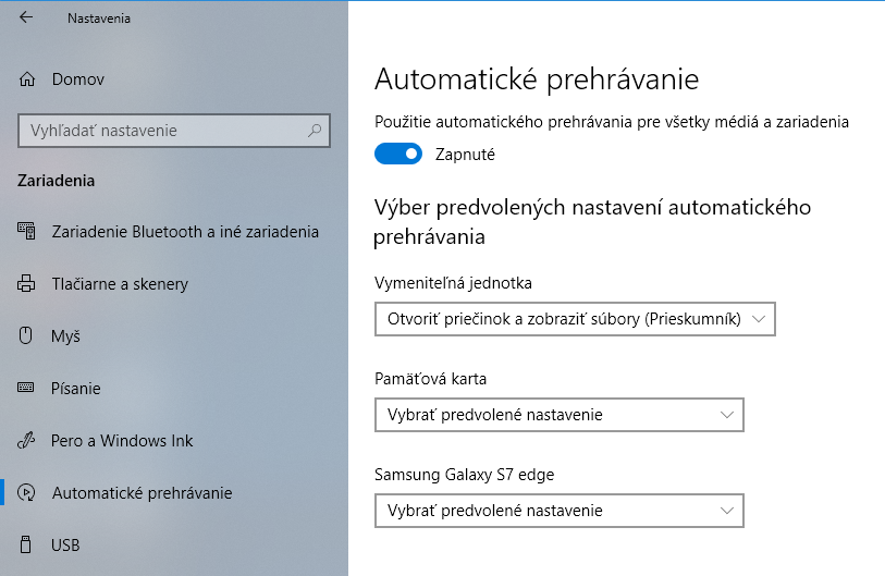 Nie je sa však kvôli tomu nutné obávať. Zapamätané nastavenie pre jednotlivé zariadenie je možné dodatočne konfigurovať. Stačí kliknúť na menu Štart, kde pomocou ikony ozubeného kolieska spustíte Nastavenie. V ňom otvorte kategóriu Zariadeniaa následne sa na panely vľavo prepnite na sekciu Automatické prehrávanie.