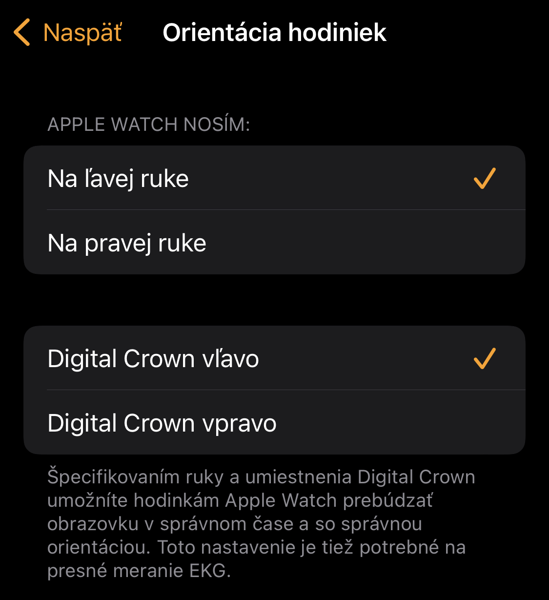 Správne nastavenie orientácie Apple Watch, resp. presným špecifikovaním ruky a umiestnenia „Digital Crown“ umožníte hodinkám prebúdzať displej v správnom čase a so správnou orientáciou. Toto nastavenie je rovnako potrebné na presné meranie EKG.