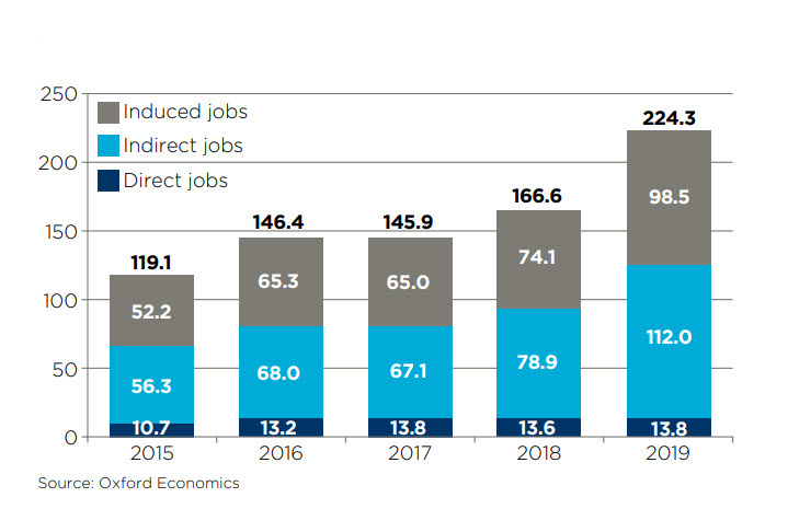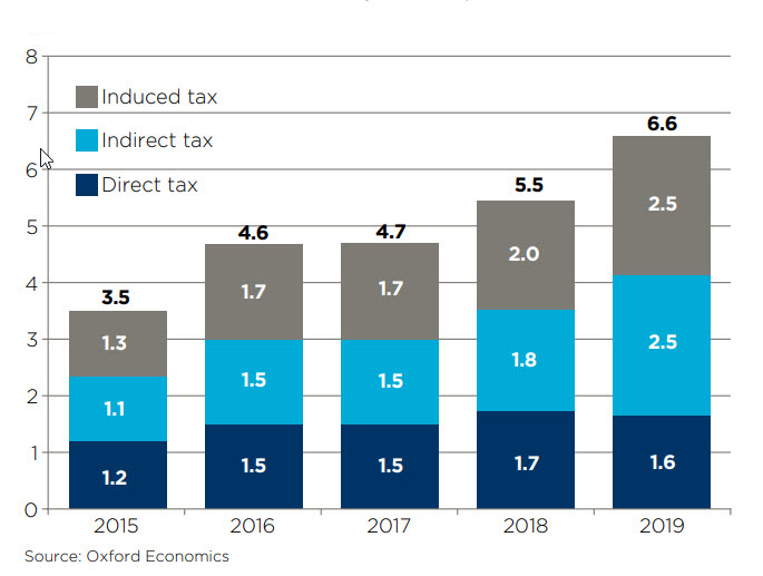 - následne vyvolaný vplyv (inducted), ktorý zahŕňa širšie ekonomické črty vychádzajúce z miezd v celom sektore. Tieto peniaze neskôr ľudia míňajú v maloobchode, pri oddychu a pod. a tvoria odvodený zisk pre iné spoločnosti