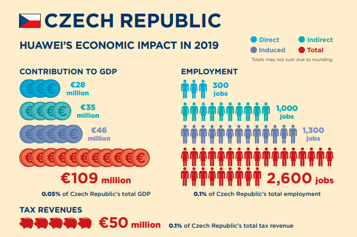 Huawei je naozaj veľká spoločnosť a na hrubom domácom produkte v roku 2019 sa podieľala sumou až 16,4 miliardy eur. Je to celkový vplyv tejto firmy, do ktorého je započítaný priamy vplyv (2,6 miliardy), ale aj nepriamy cez partnerov a straty spôsobené nižšou spotrebou.