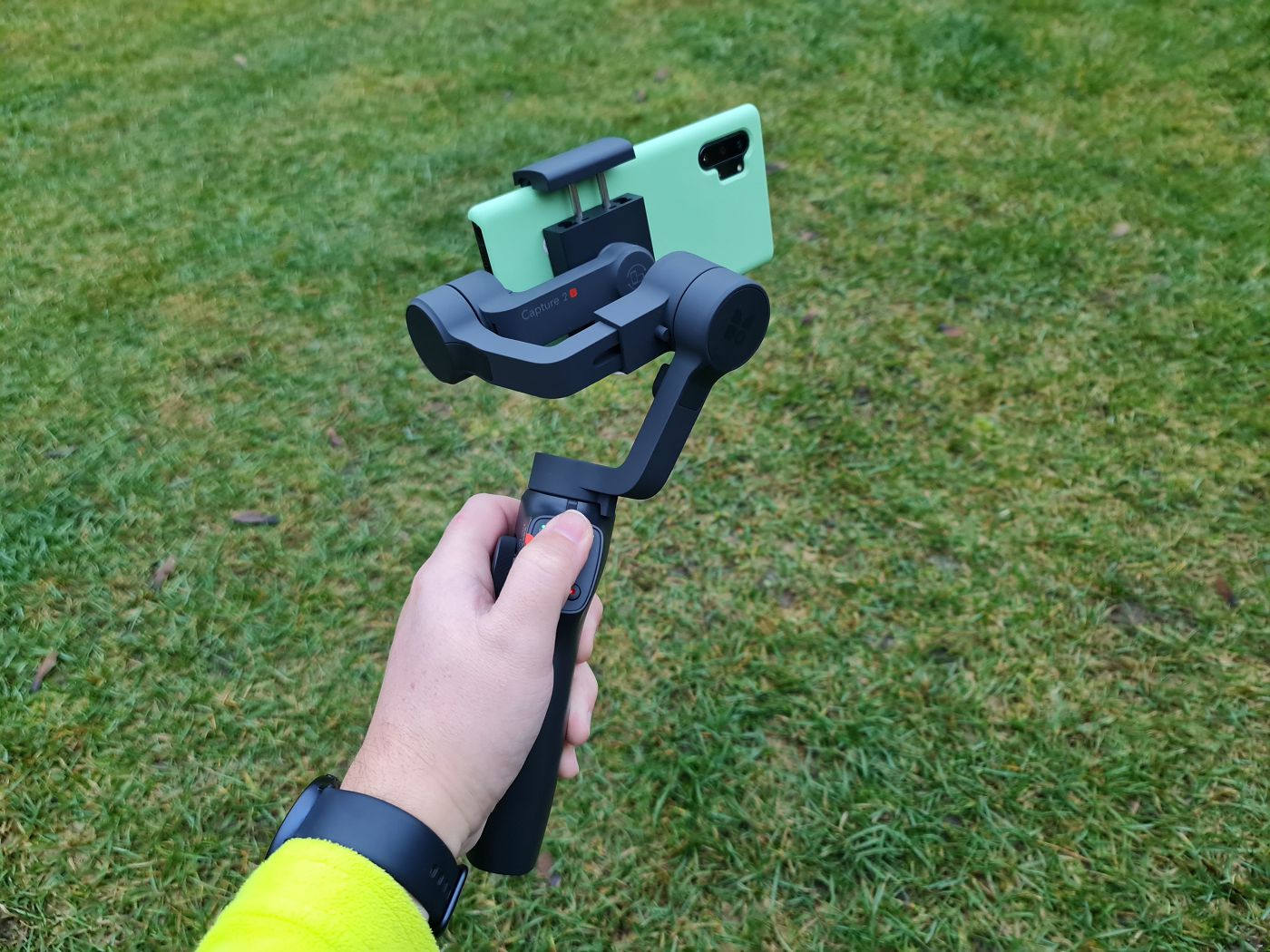 Ak ste už niekedy používali nejaký gimbal, ovládanie vám bude jasné. Gimbal drží telefón v stabilnej polohe, pokiaľ ho viac nahnete alebo vytočíte do strán, začne ho pomaly a plynulo posúvať želaným smerom. Na pohyb do strán sa dá využiť aj malý joystick. Keď stlačíte tlačidlo na prednej strane (od vás), stabilizátor bude fixovať telefón presne na danú scénu aj pri všakovakom vytáčaní. Jediným limitom sú vtedy možnosti jeho kĺbového mechanizmu.