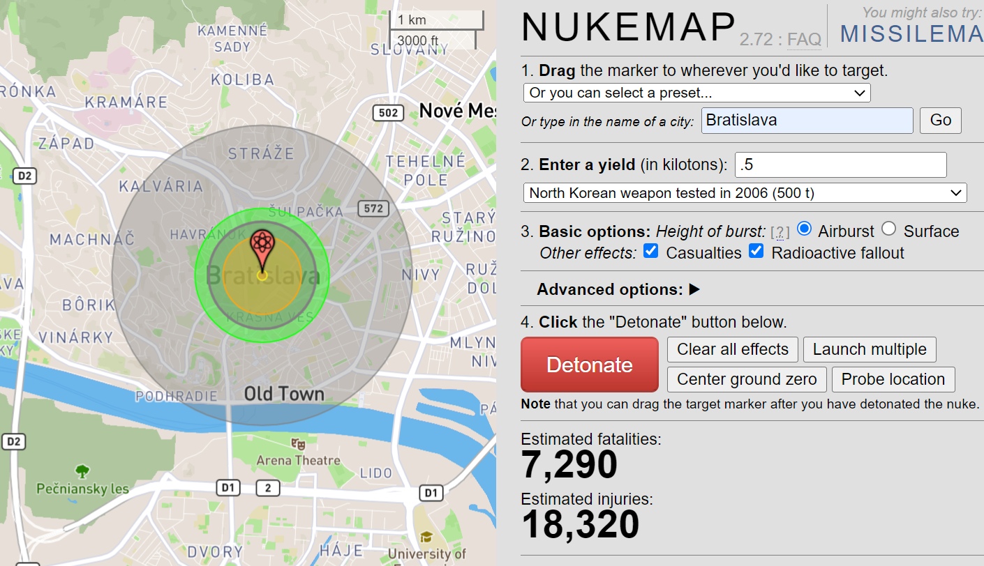 K tomu sa dá zahrnúť výpočet obetí alebo zohľadniť rádioaktívny spád. Stránka ponúka vysvetlivky k jednotlivým kružniciam. Výsledok totiž zobrazí viac sústredných kruhov v rôznych farbách. Takto budete vedieť posúdiť, čo znamená výbuch v centre dopadu a aký vplyv to bude mať na oblasti vzdialené niekoľko kilometrov.