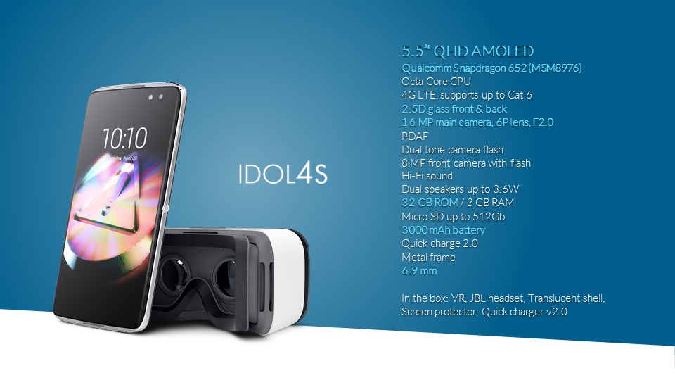 Novinkou je model Idol 4S, ktorý sa predáva aj na Slovensku. Výborný je 5,5 palcový AMOLED displej s vysokým rozlíšením. Hlavnou výhodou Alcatel telefónov je ich cena.