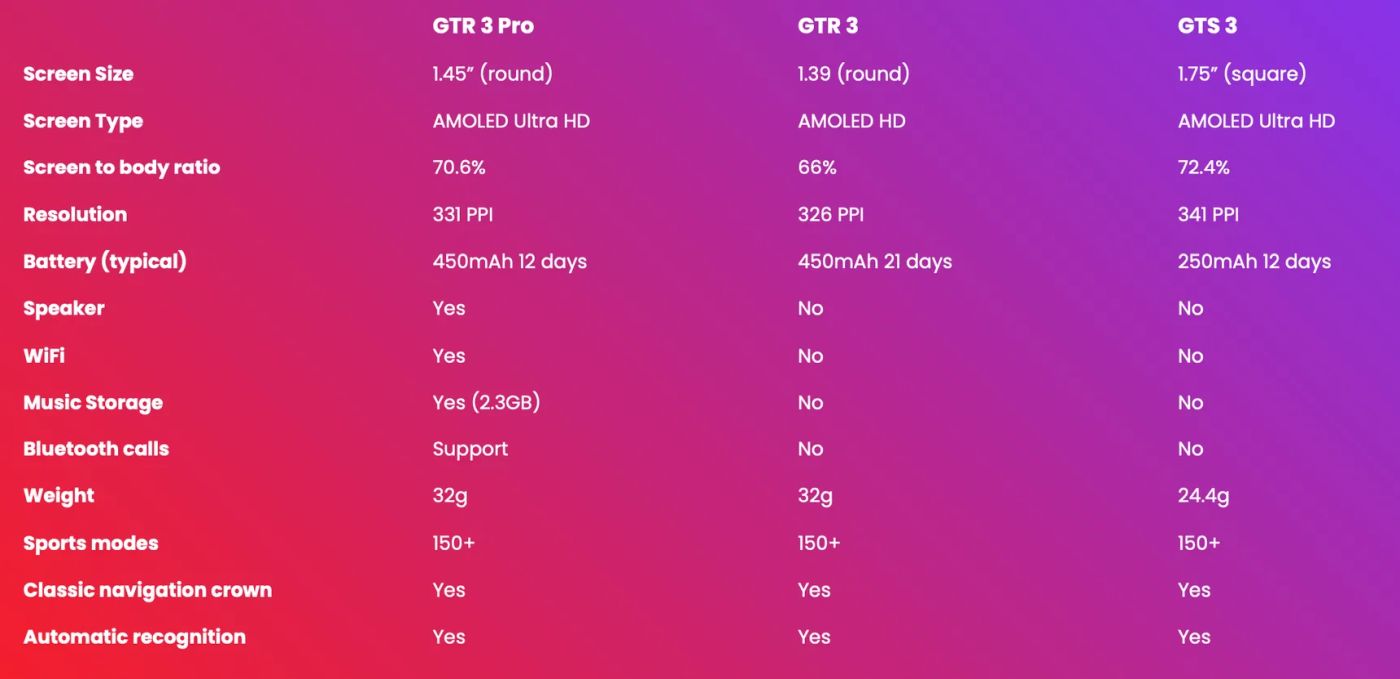 Najlepšie vybavenými hodinkami novej generácie sú Amazfit GTR 3 Pro. Tie sa budú v Európe predávať za cenu 199,99 eur a ponúkajú 1,45-palcový okrúhly AMOLED displej s hustotou 331 ppi a maximálnym jasom 1000 nitov. Hodinky majú vo výbave Wi-Fi, GPS, úložisko na hudbu (2,3 GB použiteľného miesta) a vďaka zabudovanému mikrofónu a reproduktoru podporujú aj telefonovanie cez Bluetooth.