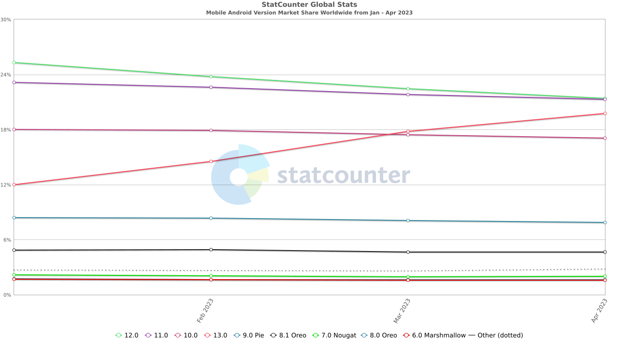 V minulosti Google poskytoval štatistiky na mesačnej báze, teraz sa to deje štvrťročne a používatelia tak môžu vidieť skokové zmeny v prijatí operačných systémov. Pod prijatím máme na mysli implementáciu od výrobcu do svojich smartfónov, pretože na tomto záleží najviac. Hoci si používatelia môžu stiahnuť nový Android aj inou formou, je to spojené s rizikom, že prídu o záruku smartfónu alebo sa im po zásahoch nepodarí nabootovať, Aktuálne má Android 13 iba 12,1% percentný podiel, server StatCounter uvádza podiel okolo 20 %.