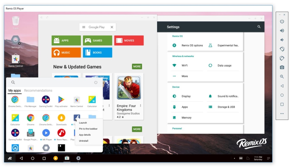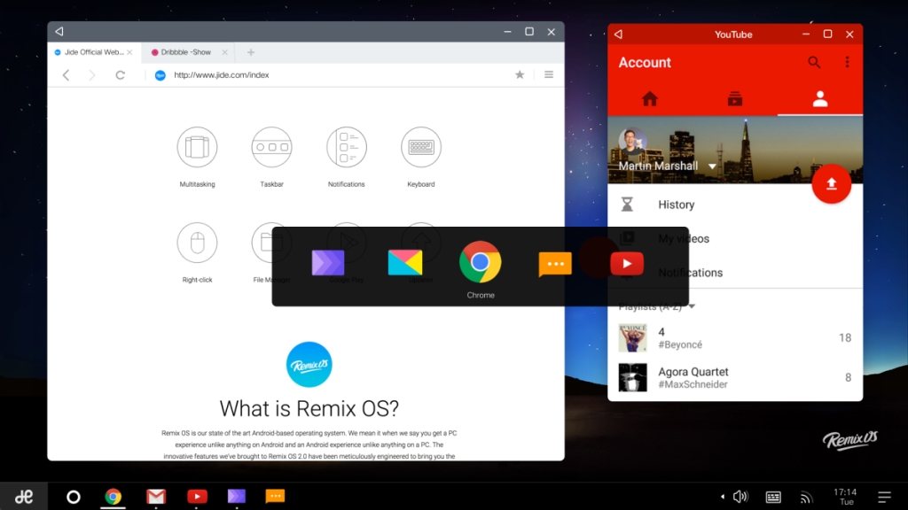 Remix OS je v jadre Android, ako ho poznáte z tabletov alebo smartfónov. Základom tohto systému je však používateľské rozhranie, ktoré je prispôsobené pre potreby stolných počítačov a notebookov. V praxi to znamená, že máte k dispozícii peknú pracovnú plochu s košom a prieskumníkom súborov. Nechýba spodná lišta, ktorá by sa nestratila ani v systéme Windows a ponuka, ktorá pripomína Štart z platformy od Microsoftu. Tu nájdete všetky nainštalované aplikácie a prístup do obchodu Google Play. Nechýba vyhľadávanie (v rámci nainštalovaných aplikácií) a tlačidlo pre vypnutie počítača.