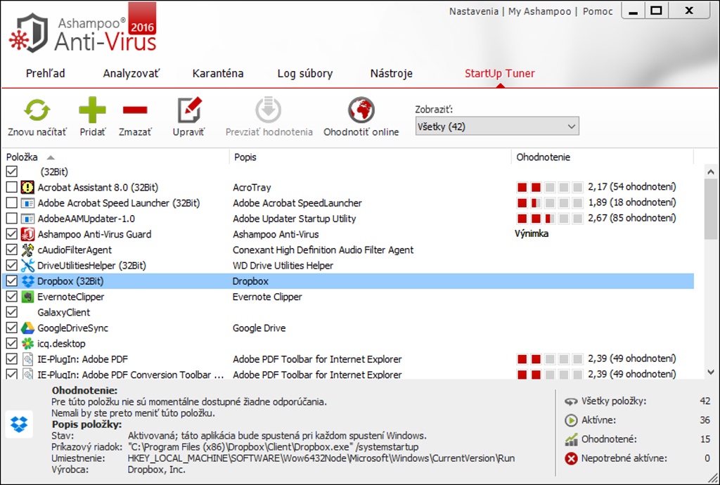 Avast! Premierje komplexný antivírusový systém pokrývajúci širokú škálu bezpečnostných funkcií. Získate s ním nielen obligátne funkcie ako antivírusový skener alebo firewall, ale aj utility navyše. Pre tých, čo sa obzvlášť obávajú, stojí za povšimnutie práve upravený prehliadač Chrome určený pre on-line bankovníctvo. Ashampoo Anti-Virus 2016 je antivírus bez firewallu a ďalších funkcií. Výhodou sú dve skenovacie jadrá, nižšia cena a ako to už býva, získate aj nástroje navyše. My sme síce pociťovali mierne spomalenie systému, no môžete si ho vyskúšať a uvidíte sami. Tento článok vyšiel aj v tlačenom júlovo-augustovom vydaní TOUCHIT č. 6/2016, preto sa niektoré skutočnosti uvedené v článku, môžu odlišovať oproti aktuálnemu dátumu publikovania.