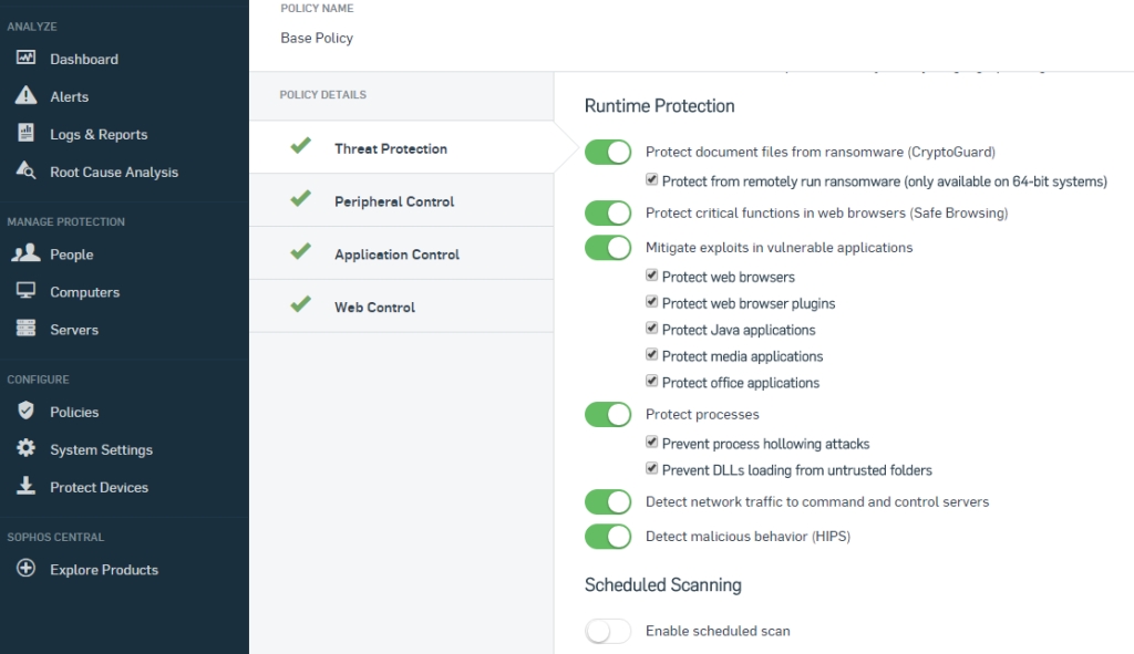 Program umožňuje zakázať používanie vymeniteľných jednotiek alebo Bluetooth, či Wi-Fi. Je len na administrátorovi, akú politiku zabezpečenia si pre jednotlivé počítače zvolí. Ochrana je rozdelená do štyroch okruhov. Zameriava sa na ochranu proti hrozbám, manažment periférií, aplikácie ako otravné nástrojové lišty sťahované z internetu a webovú kontrolu. Výrobca urobil to, čo dnes majú mnohé antivírusy a zabezpečovacie programy – nastavil ochranu tak, aby bola univerzálna. Nastavenia nie je treba meniť. Zmeny budete pravdepodobne vykonávať vtedy, ak by niektoré z programov boli rozpoznané ako škodlivé a vy by ste ich chceli napriek tomu povoliť. Ochrana je nastavená tak, aby zachytila pokusy z lokálnej siete a internetu, webových skriptov, multimediálnych programov atď. teda zo všetkých oblastí, ktoré bývajú zneužité ransomwarom. Tým, že všetky nastavenia robíte cez vzdialenú správu, môžete ochrániť počítač pred používateľom, ktorý by nastavenia menil podľa seba.
