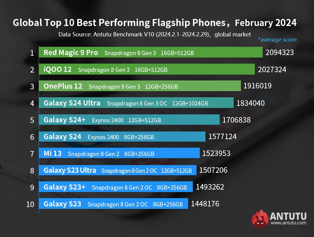 Na prvom mieste aprílového zoznamu sa umiestnil Asus ROG Phone 8 Pro s priemerným skóre na úrovni 2 120 210 bodov. Druhé miesto si uchmatol iQOO 12 s 2 090 252 bodmi a na treťom mieste sa umiestnil RedMagic 9 Pro+ s priemerným skóre 2 080 678 bodov.