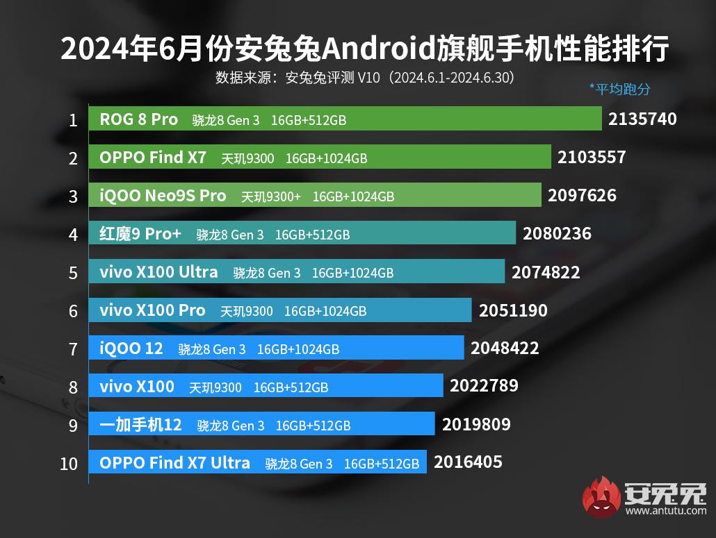 Medzi najvýkonnejšími smartfónmi za jún 2024 nechýba ROG 8 Pro so ziskom 2135740 bodov. Na druhom mieste sa v tesnom závese umiestnil Oppo Find X s priemerným skóre na úrovni 2103557 bodov. TOP 3 uzatvára iQOO Neo9S Pro so skóre 2037626 bodov. Hoci prvé miesto obsadil model s čipsetom Snapdragon 8 Gen 3, tak v tesnom závese druhé a tretie miesto obsadili modely s čipovými sadami Dimensity 9300 a 9300+ od MediaTeku.