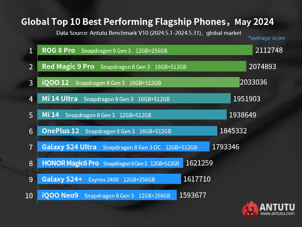V prvej päťke sa umiestnili aj dva modely od Xiaomi. Konkrétne ide o Xiaomi 14 Ultra a model Xiaomi 14. V druhej časti TOP 10 sa nachádzajú modely OnePlus 12, Galaxy S24 Ultra , Honor Magic6 Pro a Galaxy S24+. Desiatku najvýkonnejších globálnych vlajkových lodí uzatvára IQOO Neo9 s priemerným skóre na úrovni 1 593 677 bodov.
