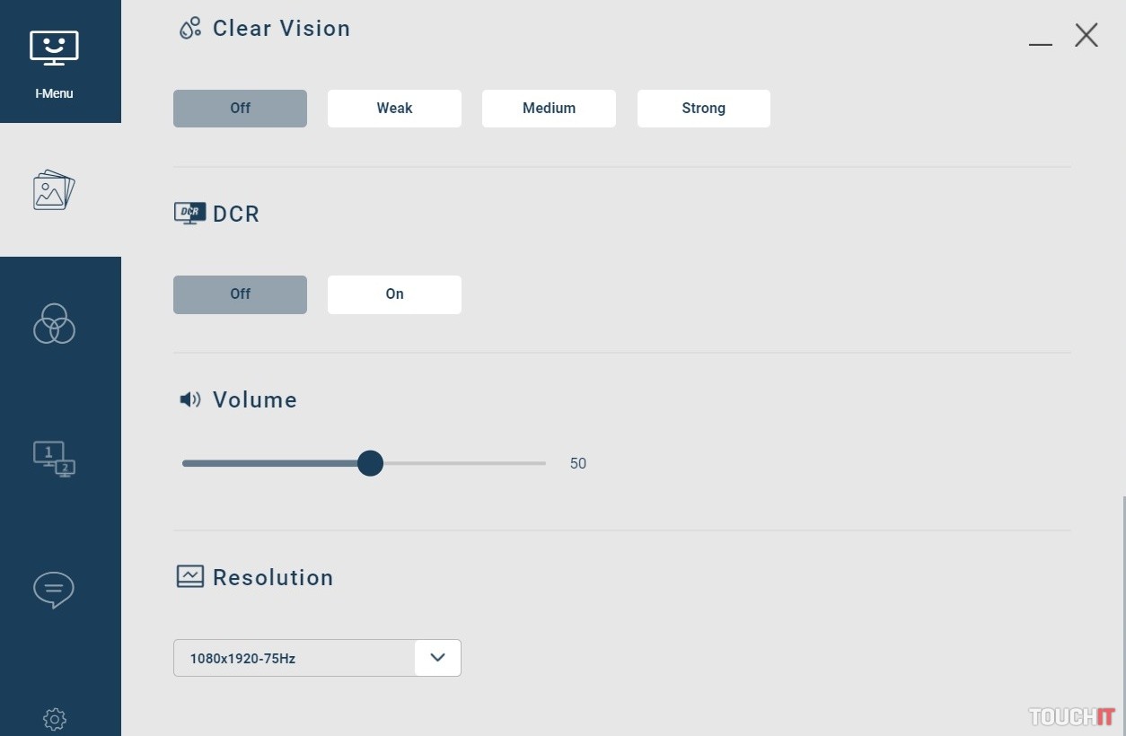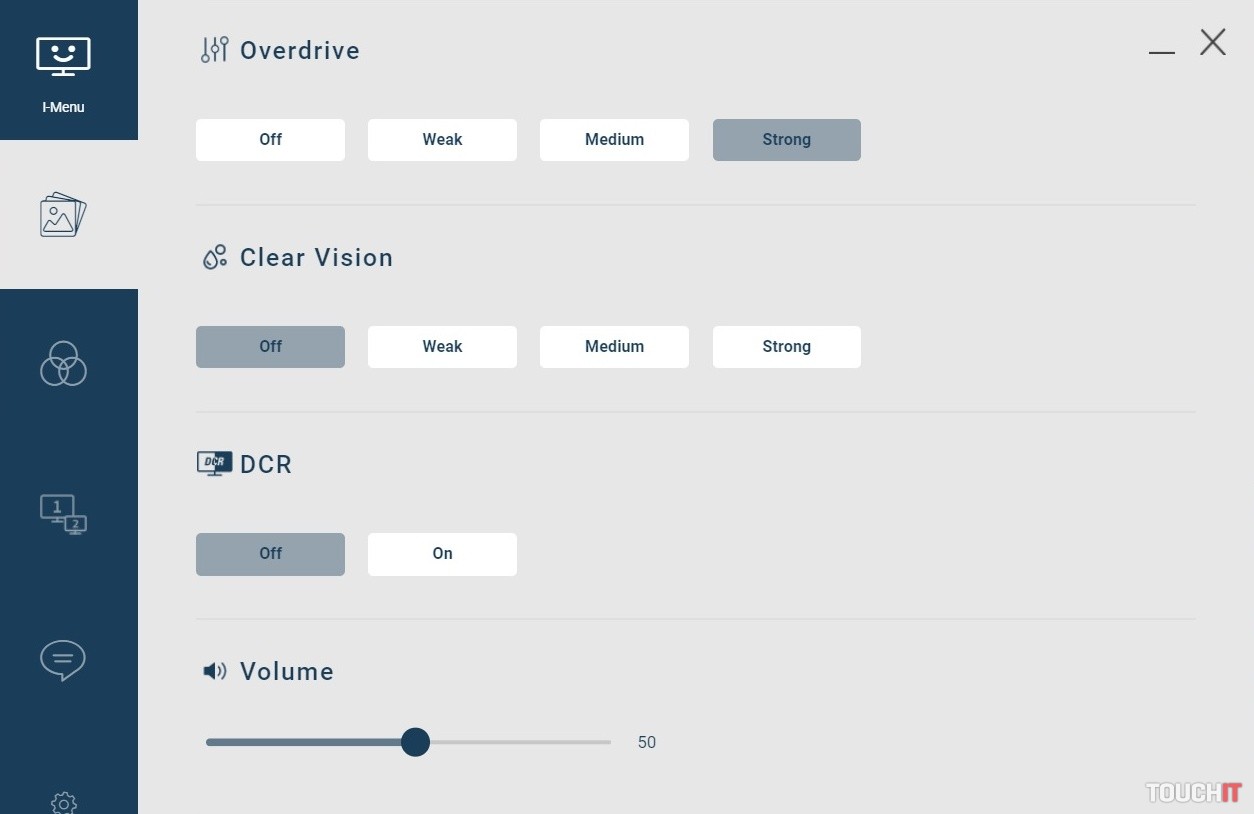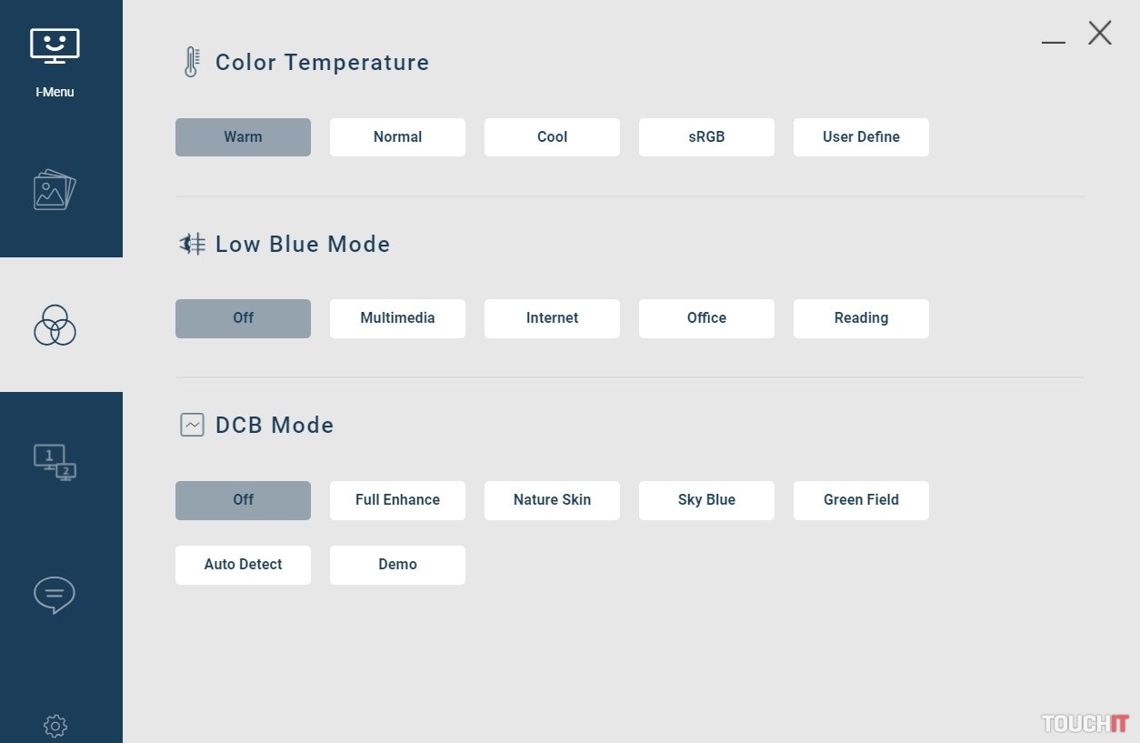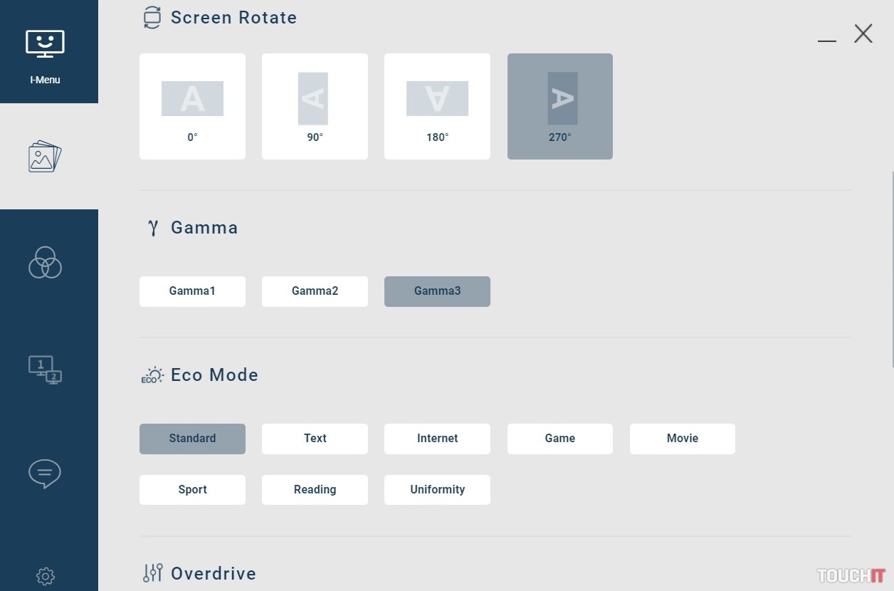Systém i-Menu totiž umožňuje priamy prístup ku všetkým nastaveniam v prehľadnej a graficky jednoduchej ponuke. Za najväčší prínos považujem rýchle nastavenie orientácie obrazovky v prípade, že monitor používate striedavo v horizontálnej alebo vertikálnej polohe.