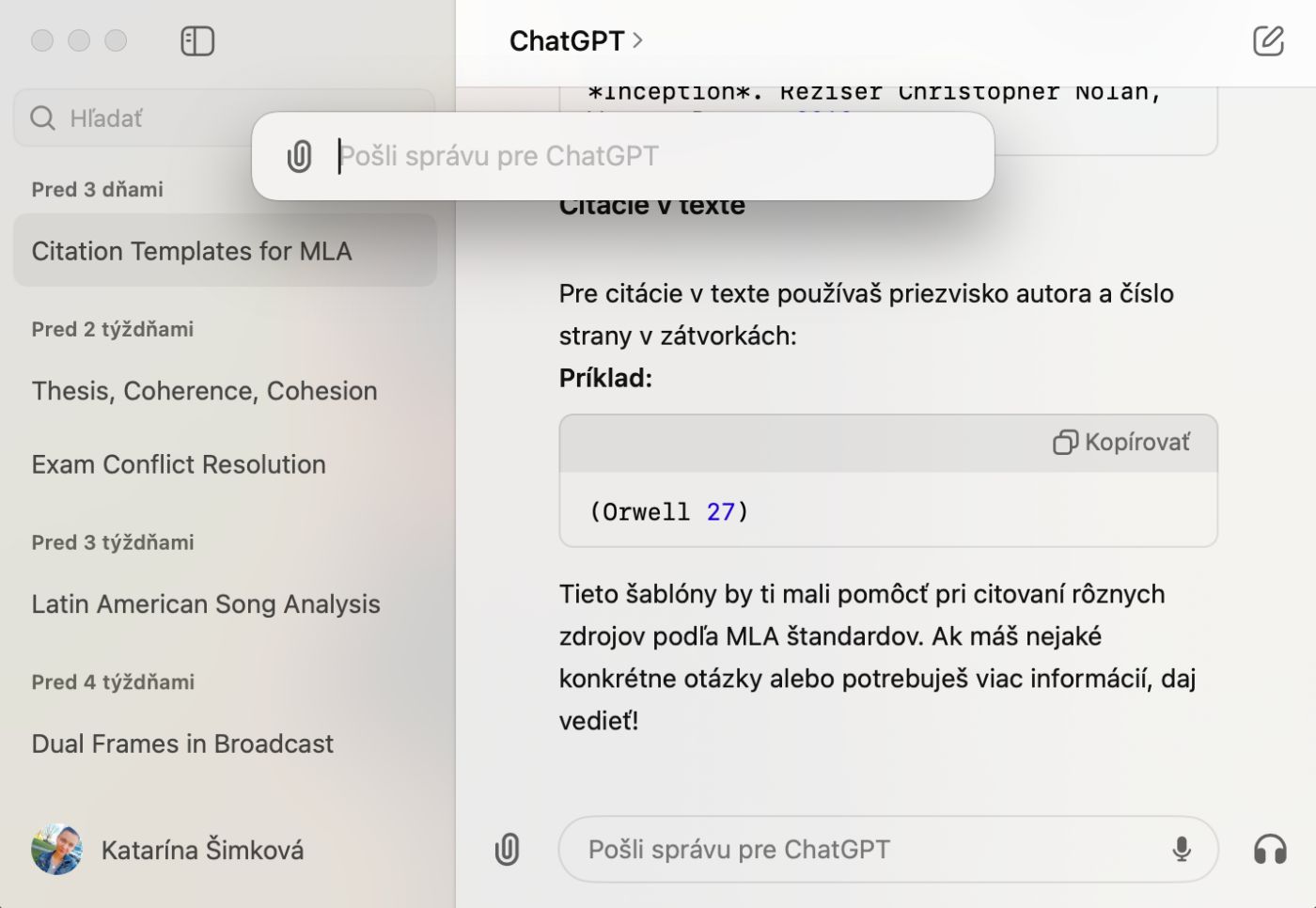 Z pohľadu používania je zážitok skutočne podobný, ako keď si chatbota otvoríte v rámci webového rozhrania. Aplikácia však zvyšuje pohodlie pri používaní, keďže si ChatGPT otvoríte skutočne rýchlo a jednoducho. Už pri úvodnom spustení vás navyše upozorní na jednoduchý príkaz kombinácie klávesu Option a medzerníka, ktorou si chatbota otvoríte v riadku, kde sa ho spýtate otázku. Po vytvorení otázky alebo príkazu sa vám otvorí celá aplikácia ChatGPT.