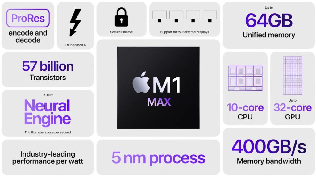 Apple tvrdí, že oba nové procesory sú dvakrát tak rýchle ako MacBooky Pro s procesorom Core i9 z hľadiska výpočtového výkonu a 2,5× rýchlejšie (M1 Pro), resp. až 4× rýchlejšie (M1 Max) z hľadiska grafického výkonu. Zároveň podporujú až 32 GB RAM, resp. 64 GB RAM (M1 Max) a umožňujú pripojenie k dvom (M1 Pro) až štyrom externým obrazovkám (M1 Max).