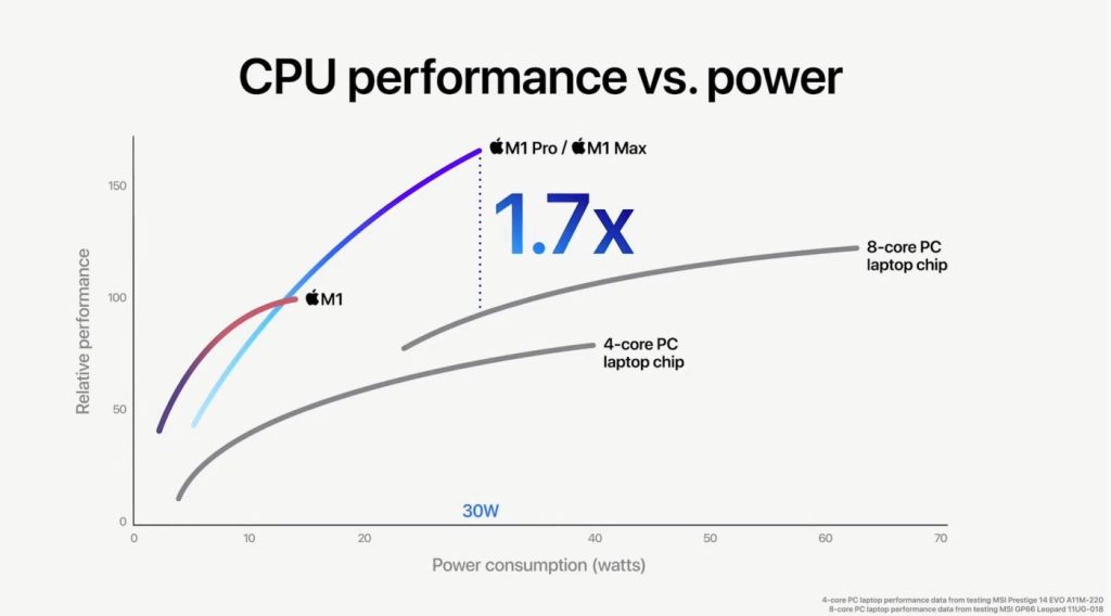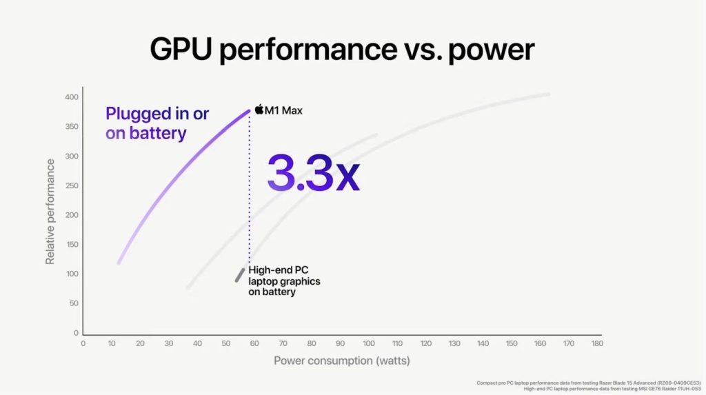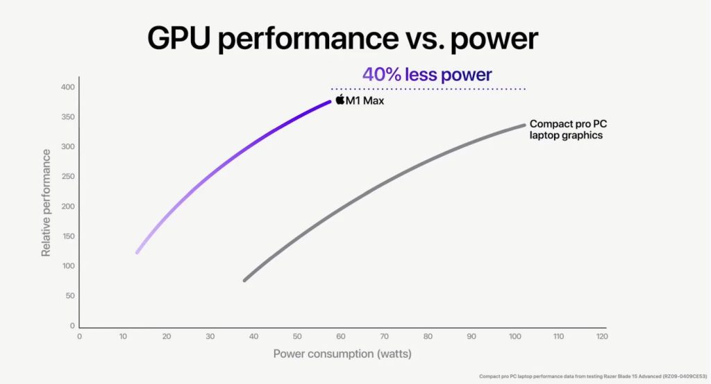 Kľúčová je takisto ich energetická efektivita – Apple prezentoval viacero porovnaní, v ktorých prezentoval aj to, že M1 Max dosahuje totožný grafický výkon ako notebook s dedikovanou grafickou kartou, avšak má o 40 % nižšiu spotrebu. A aj vďaka energetickej efektivite ponúka 14,2-palcový model výdrž na úrovni až 17 hodín prehrávania Full HD videa, resp. až 21 hodín v prípade 16,2-palcového modelu.
