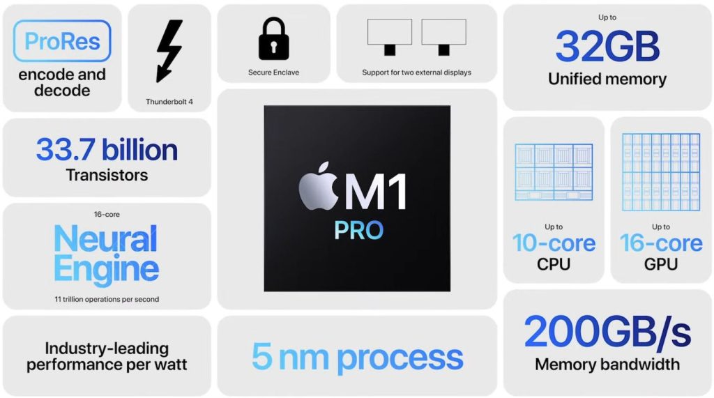 Hlavným lákadlom novej generácie sú však jednoznačne procesory Apple M1 Pro a M1 Max. Tie zlepšujú rok starý čip Apple M1 z hľadiska výkonu a takisto eliminujú jeho hlavné nedostatky, ako je obmedzenie veľkosti operačnej pamäte a podpora pripojenia viacerých externých monitorov. Z nových MacBookov Pro vďaka tomu robia stroje pre profesionálov a náročných používateľov, ktoré aktuálne doslova nemajú konkurenciu.