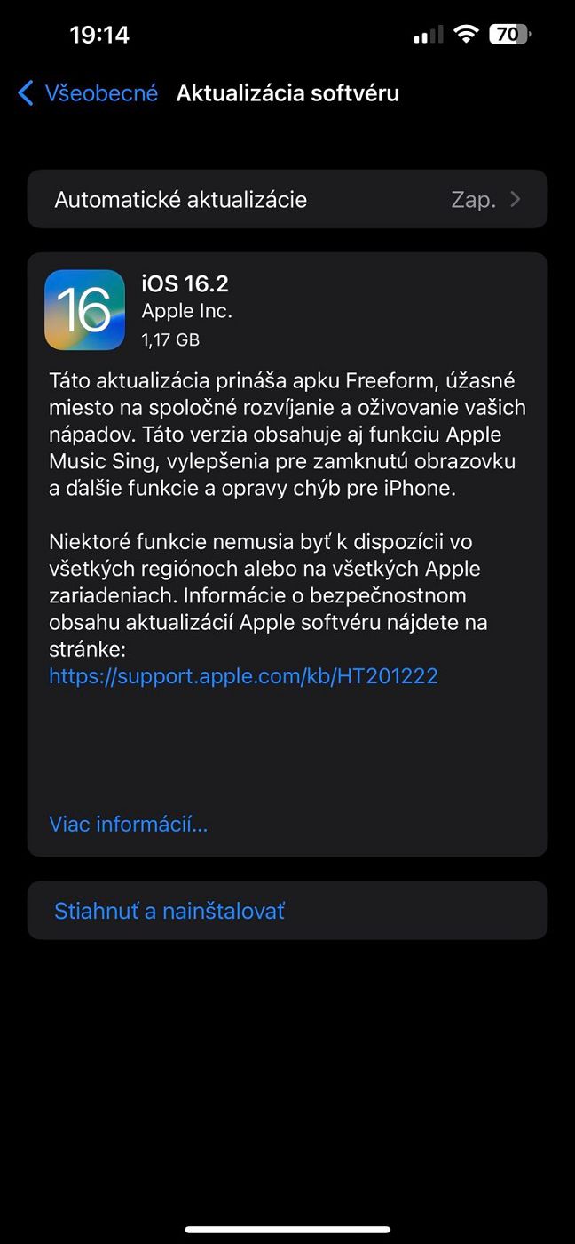 Spoločnosť Apple vydala novú verziu operačného systému pre telefóny iPhone s číselným označením 16.2. Aktualizáciu dostávajú aj iPady (verzia iPadOS 16.2) a takisto aj hodinky Apple Watch (watchOS 9.2).