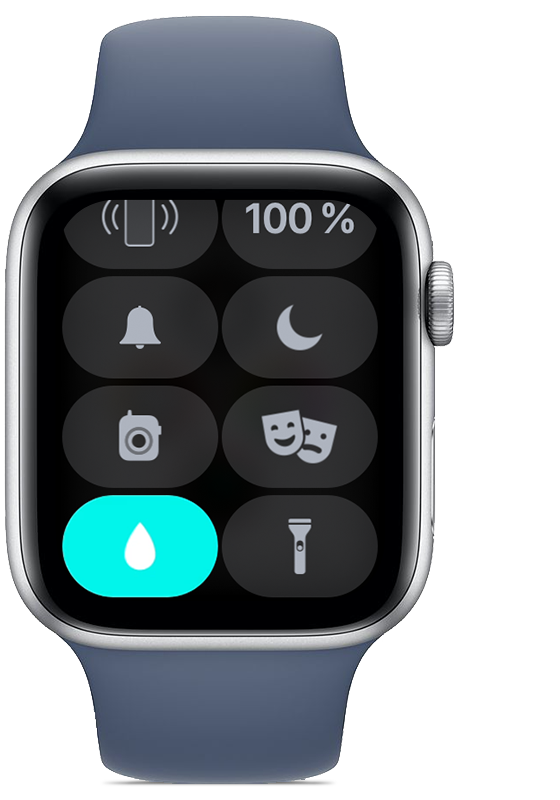 Zapnutie režimu – zamknutie vo vode.Dotknite sa spodnej časti displeja a potiahnite nahor, pričom sa vám zobrazí ovládacie centrum. Rolujte hore a nájdite ikonu s motívom kvapky a kliknite na ňu – týmto ste aktivovali režim zamknutie vo vode, pričom sa nestane, že náhodou spustíte/vypnete nejakú akciu, displej nereaguje na dotyky. Dodajme, že režim zamknutie vo vode sa zapne automaticky aj pri začatí cvičenia vo vode, napríklad plávania alebo surfovania.