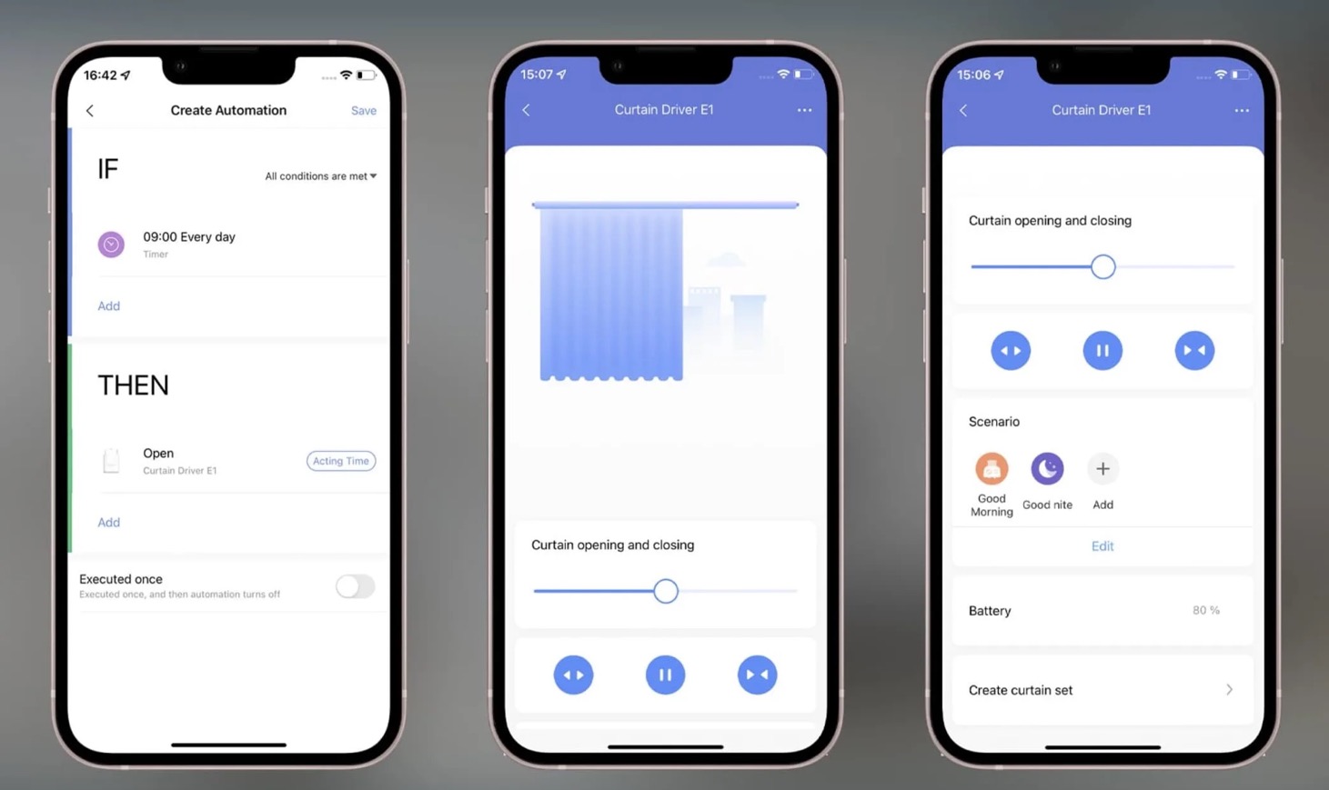 V praxi to znamená, že okrem 5 metrových kobercových závesov v prezidentskom paláci to dokáže pracovať s čímkoľvek. Jednoducho prichytíte toto zariadenie na garnižu, či už s trubkovým alebo koľajnicovým vedením (v balení sú rôzne adaptéry a pomôcky, s ktorými zvládnete inštaláciu bez akýchkoľvek problémov – treba si však vybrať vhodný typ pre vaše závesy, viď nižšie) a v aplikácii si nastavíte polohy, resp. dorazy, pokiaľ smie motorizovaná jednotka ísť. Záves môžete odťahovať otvorením aplikácie a zadaním priameho pokynu alebo si nastavíte automatizáciu, ktorá môže pracovať na základe rôznych premenných, či už podľa času alebo aktuálneho počasia. Roller shade E1 má integrovaný aj svetelný senzor, takže nastavenie automatizácie môže spočívať aj v tom, koľko svetla dopadá na zariadenia, na základe čoho bude odťahovať alebo zaťahovať záves. Rovnako tak si môžete nastaviť rýchlosť motora, aby sa záves odťahoval podľa požiadaviek rýchlejšie alebo pomalšie, napr. ráno počas východu slnka.