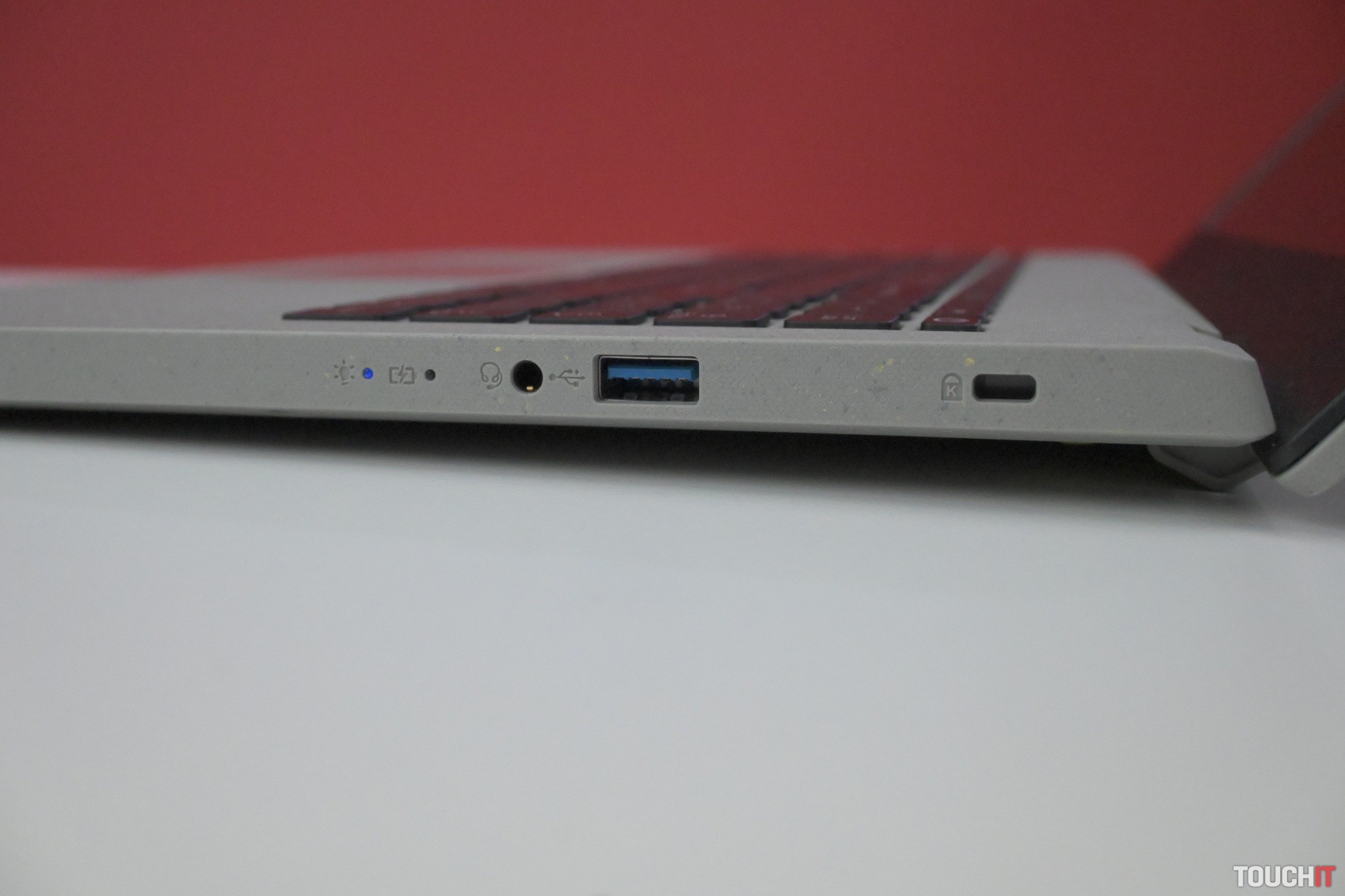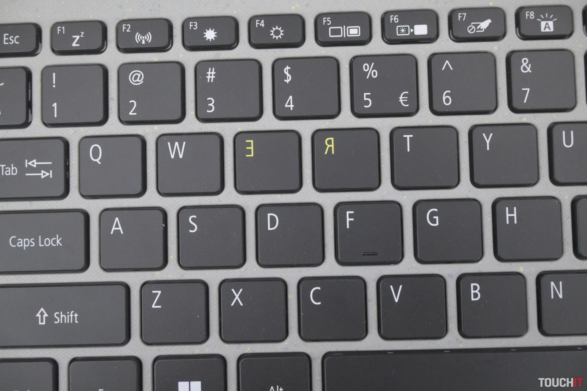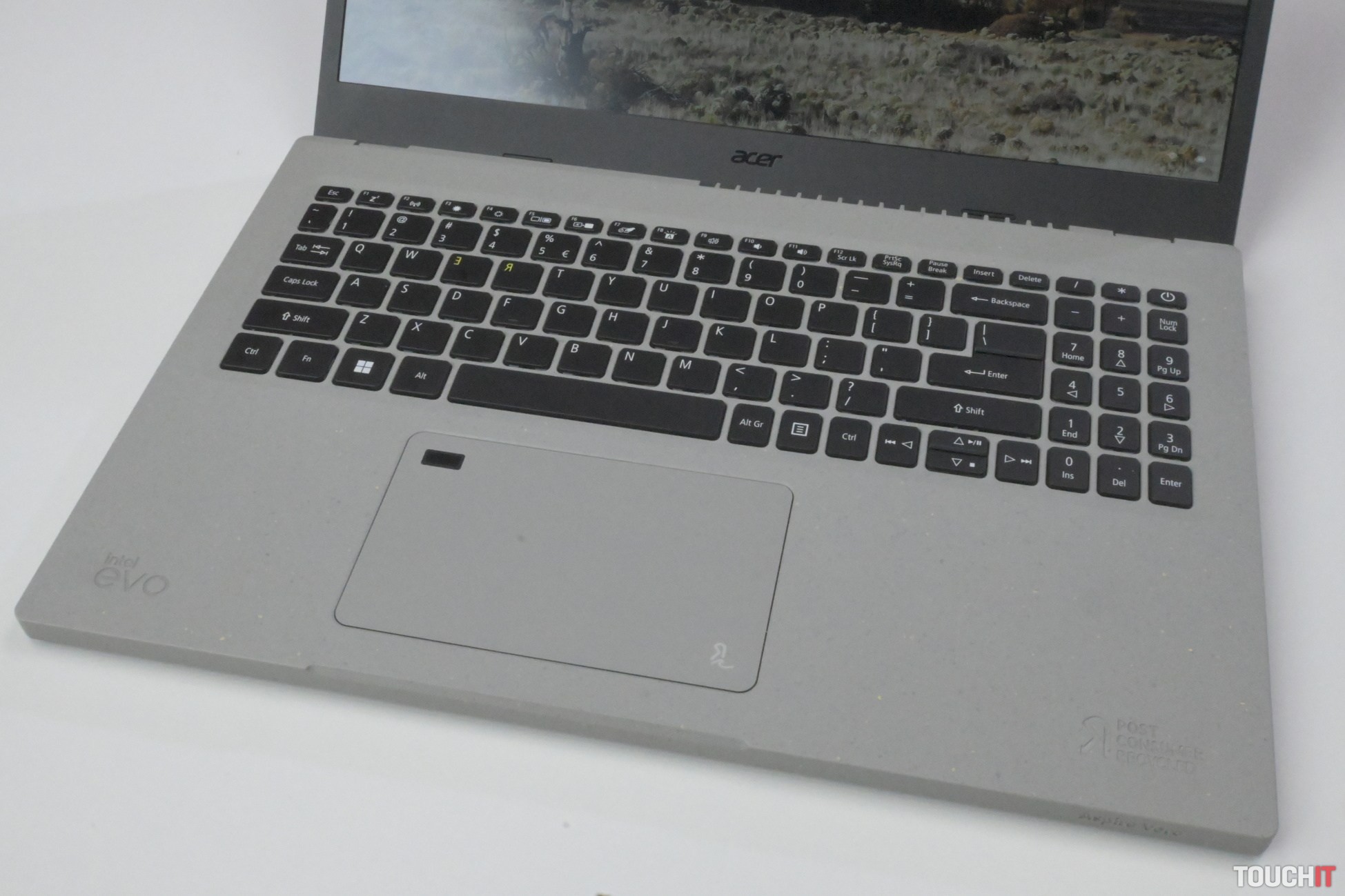 Klávesy sú z polovice z recyklovaného plastu. Je podsvietená a Acer opäť otočil písmená R a E ako symbol recyklačnej iniciatívy. Toto sa nám javí mierne navyše a je škoda otáčať orientáciu písmen. Zo začiatku to trochu mýli, dá sa na to zvyknúť a nie je to zásadný problém. Na klávesnici sa vám bude písať dobre a patrí medzi tie tichšie.