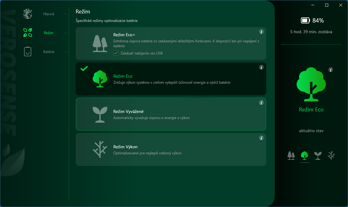 VeroSense je softvér, ktorý umožňuje nastaviť režimy šetrenia. Výrobca to poňal graficky a na základe ikony stromov sú charakterizované jednotlivé režimy. Jeden zo šetriacich režimov sa dá aktivovať pri práci na batériu. Hoci toto nie je najľahší notebook na cestovanie, dá sa prenášať a keď nebude k dispozícii elektrická zásuvka, vydržíte aj pri práci na batériu.