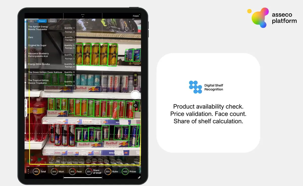 Softvér vyvinutý spoločnosťou Asseco Business Solutions využíva technológiu rozpoznávania obrazu v maloobchode a výrazne skracuje pracovný čas obchodníkov. Nástroj zabezpečuje, aby usporiadanie, obsah tovaru v regáli a všetko na ňom, vrátane cenoviek, spĺňalo smernice stanovené obchodom a výrobcom. Úkony, ktorých manuálne dokončenie trvá od 8 minút do 1,5 hodiny v závislosti od regálu, je vďaka tomu riešeniu možné dokončiť za 50 sekúnd.