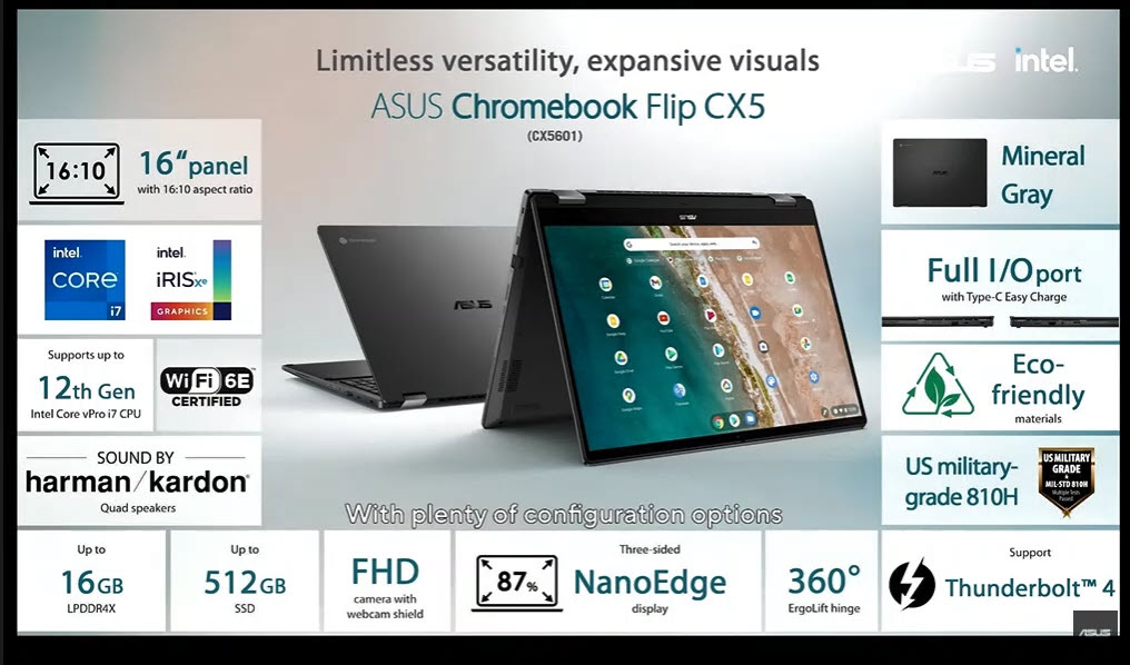 ASUS ukázal Chromebook Flip CX5, ktorý je určený na modernú prácu, učenie a zábavu. Jeho 360° pánt ErgoLift dokáže nastaviť 16-palcový displej NanoEdge do ľubovoľného uhla. Panel má pomer strán 16:10, hardvérovým základom je Intel Core i7 12. generácie a grafikou Intel Iris Xe. Pripočítajte 16 GB pamäte a dvojpásmovú sieť WiFi Intel 6E (802.11ax) vrátane nového pásma 6 GHz.