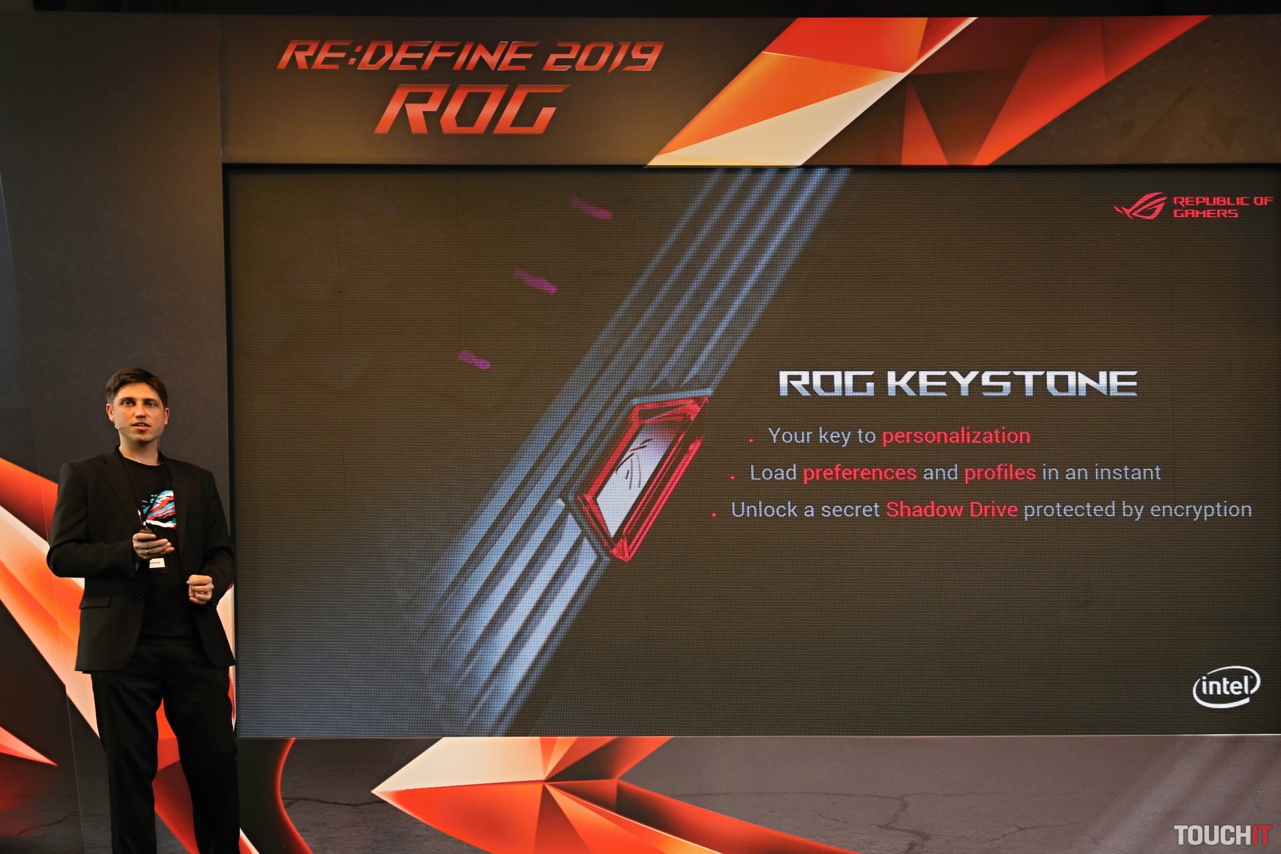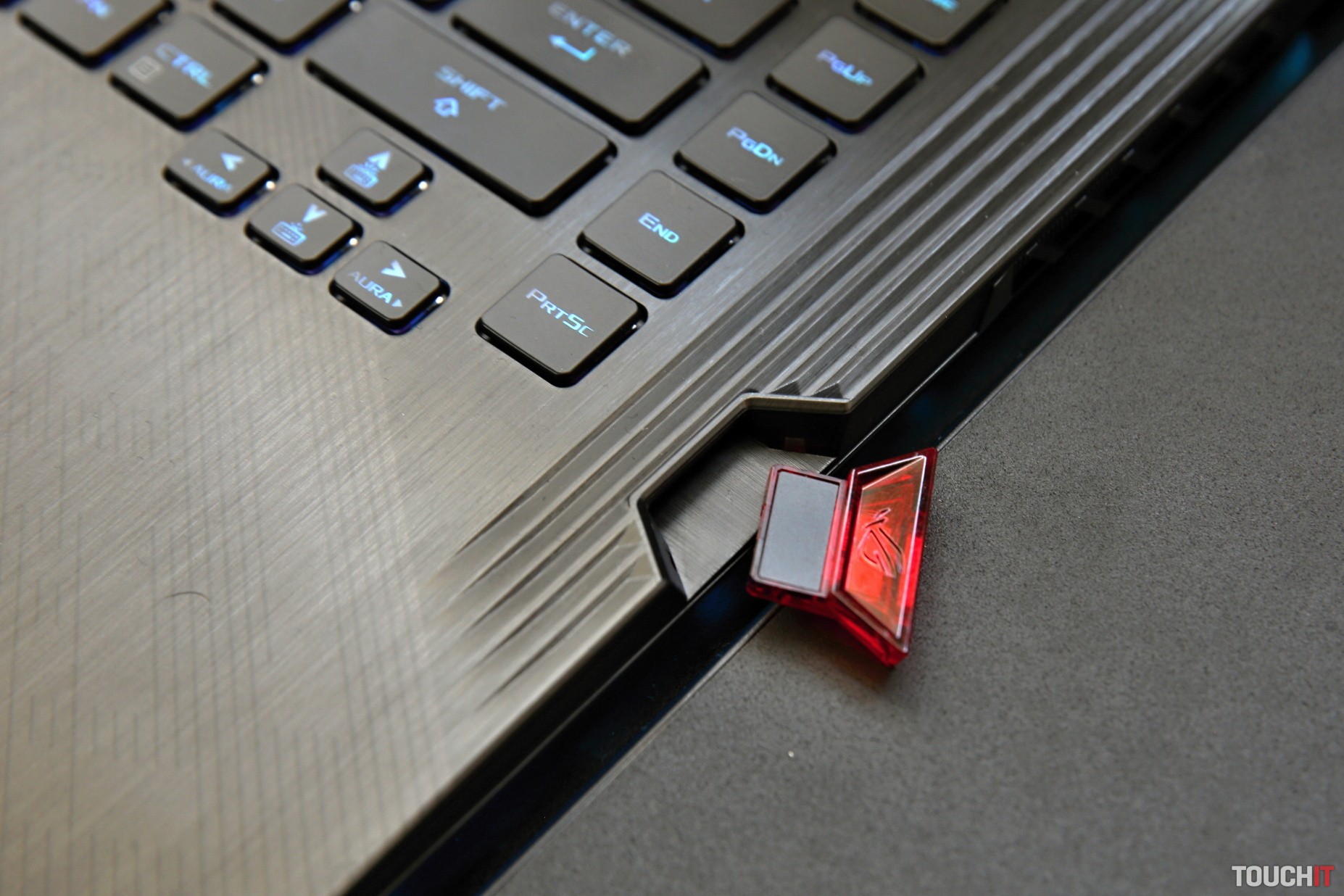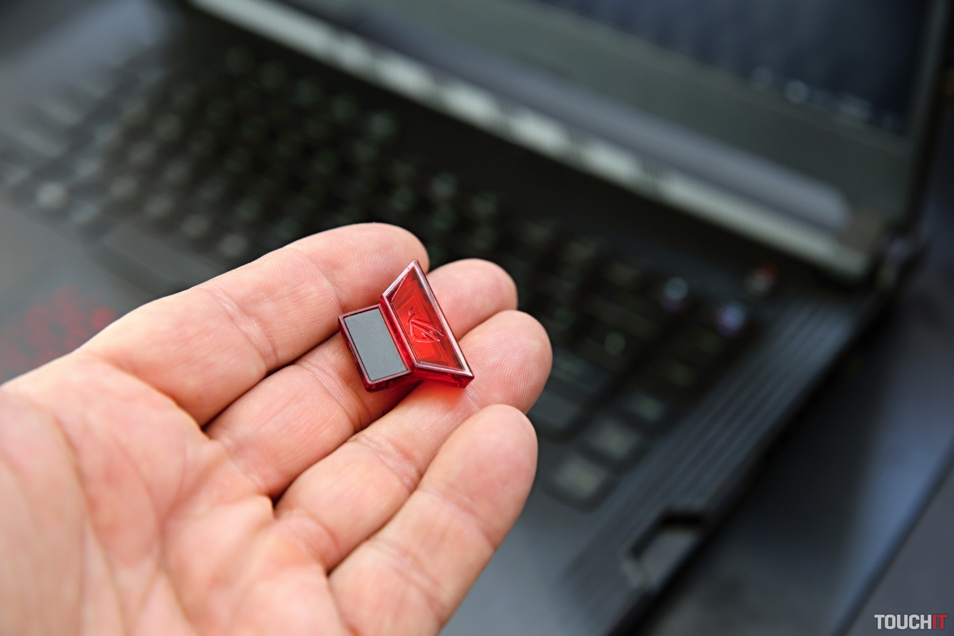 Asi najväčším prekvapením bolo zariadenie ROG Keystone. Je to čítačka zabudovaná priamo do notebooku a samotné zariadenie v podobne malého kľúča. KeyStone umožňuje lepšiu personalizáciu notebooku. Zariadenie obsahuje NFC a funguje ako fyzický kláves na zmenu osvetlenia a ďalších nastavení. Takisto umožňuje prístup do utajeného úložiska Shadow Drive, v ktorom sú skryté a tiež zašifrované dôležité súbory. Rozprávali sme sa s tímom, ktorý toto zariadenie navrhol a chceli sme, aby sa pomocou neho dalo aj prihlasovať do Windows namiesto zadávanie hesla, odtlačku prsta alebo rozpoznávanie tváre. Zatiaľ to tak nefunguje, ale špecialisti na tom pracujú – v tomto prípade ide totiž o dohodu s Microsoftom.