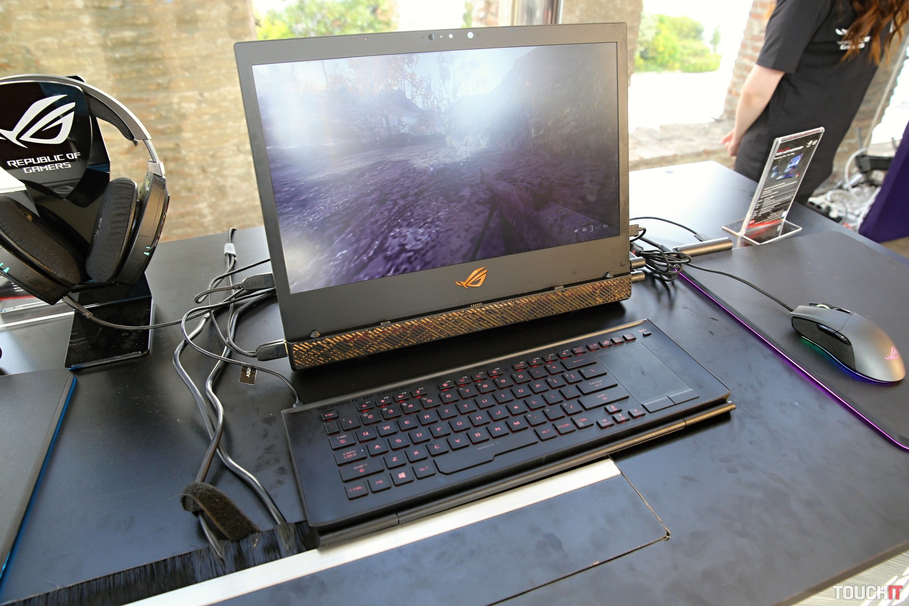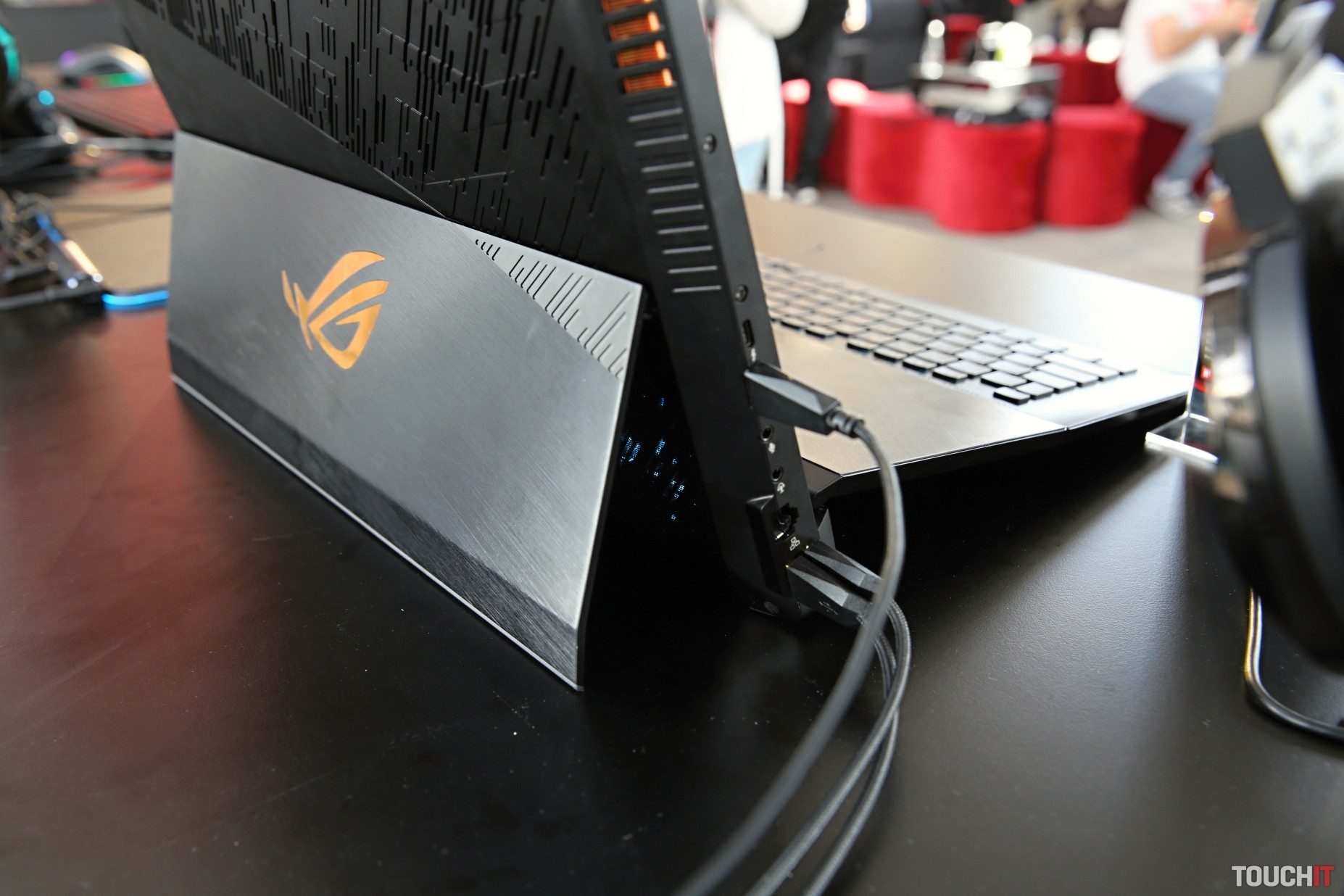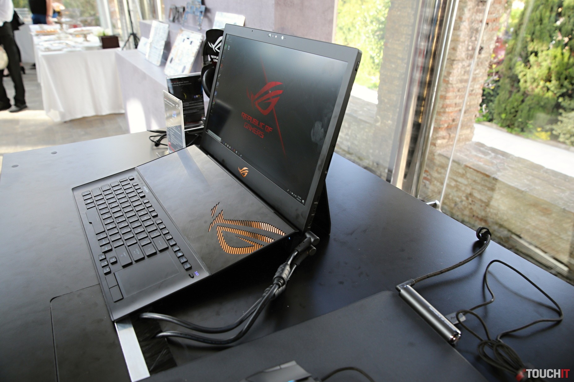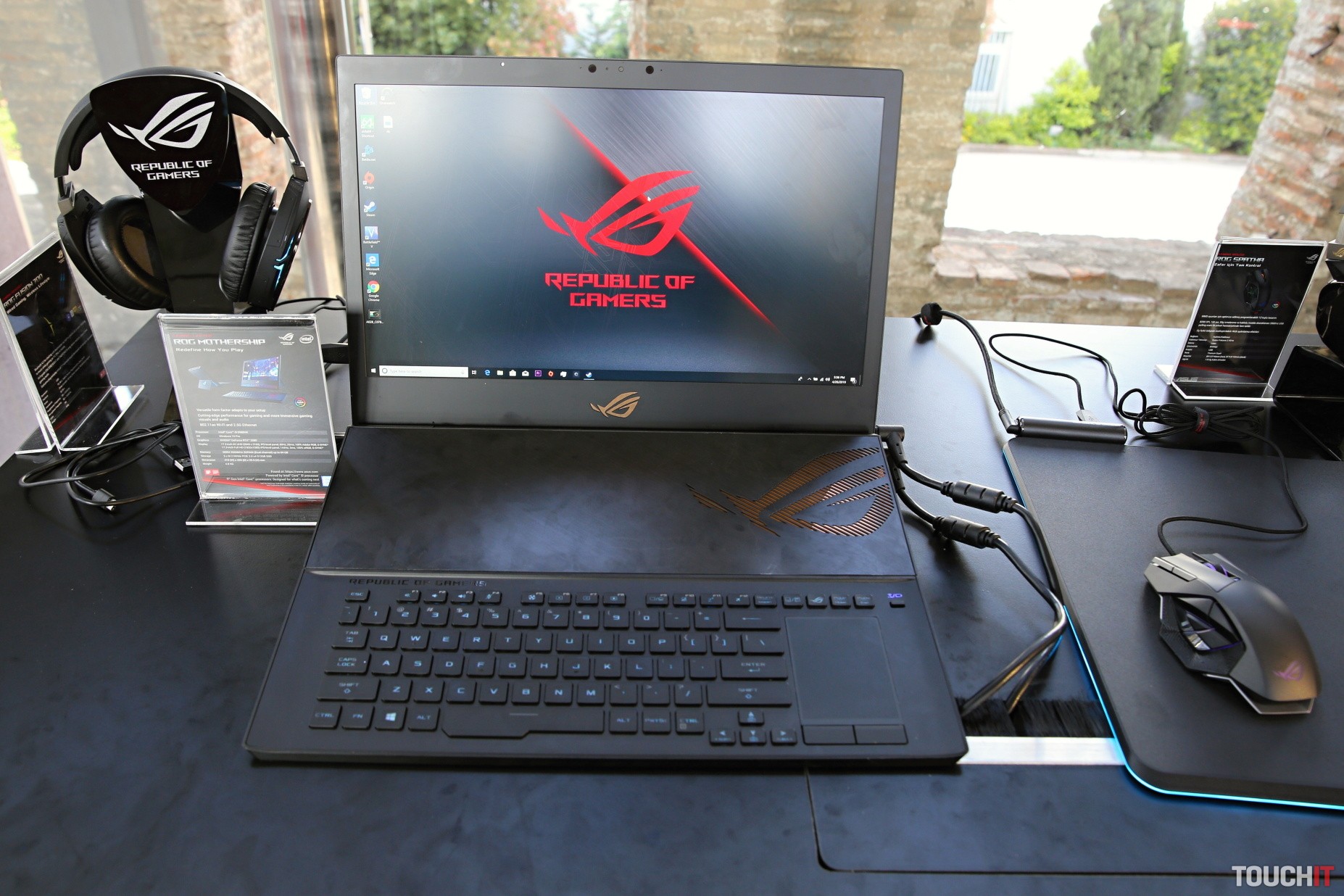 ROG Mothership položíte na stôl, pritom sa automaticky vysunie jeho podstavec. Zástupcov ASUSu sme sa pýtali, ako to majú mechanicky preverené, že toto bude dlhodobo fungovať a dostali sme odpoveď, že toto je riešenie, ktoré bolo úspešne otestované v náročných podmienkach počas naozaj intenzívneho používania. Keďže je Mothership postavený na stole, jeho chladenie funguje úplne inak. Neleží totiž na stole ako tradičné notebooky, ale využíva stojan, vďaka ktorému má chladiaci systém neobmedzený prístup k prieduchu vzduchu na zadnej strane. Klávesnica je odnímateľná a dá sa zložiť. Vtedy má Je možné ju položiť kdekoľvek a pripojiť priamo alebo bezdrôtovo. Odňatie klávesnice odkryje štyri reproduktory, ktoré smerujú priamo na používateľa.