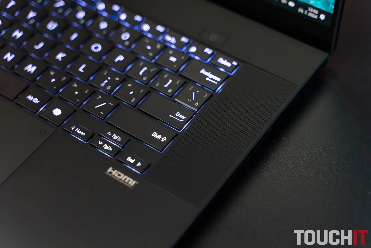 Klávesnica notebooku je výborná, avšak chýba jej numerická časť, keďže po jej bokoch sa nachádzajú reproduktory. Spínače majú celkovú vzdialenosť 1,7 mm, odozva pri stláčaní je veľmi dobrá. Klávesnica ponúka tri úrovne podsvietenia a kláves pre funkciu Copilot. Ten však aktuálne otvorí iba rovnomennú webovú aplikáciu – špeciálna Copilot aplikácia, ktorá by bola integrovaná do systému Windows, chýba.