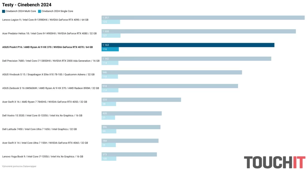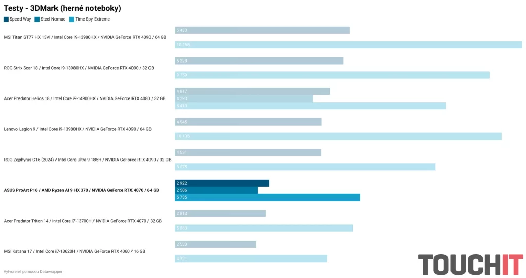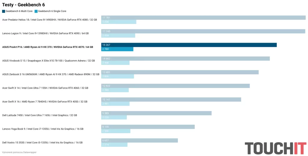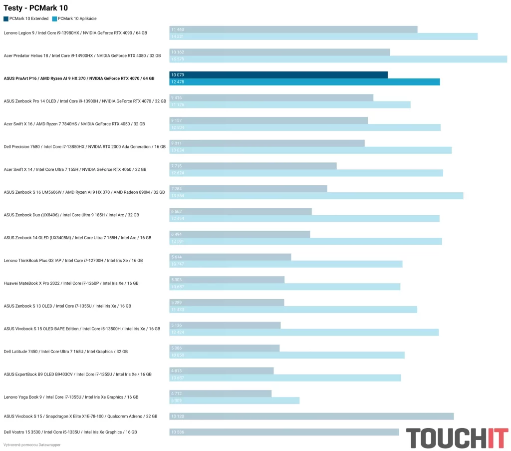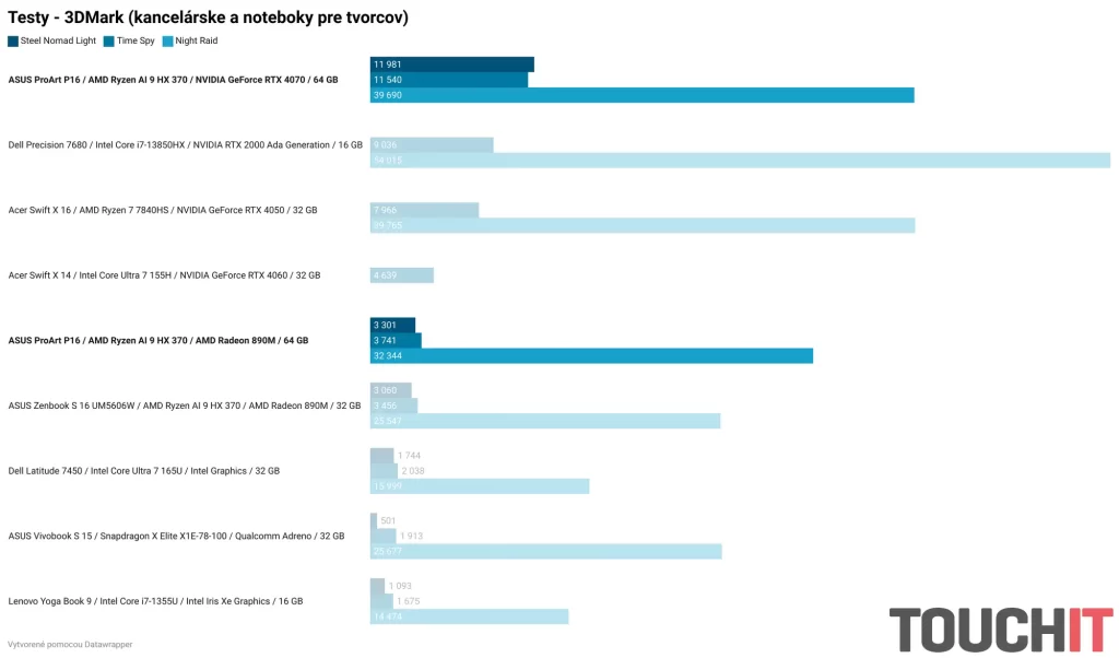 Nižšie nájdete grafy s nameranými hodnotami vo viacerých testoch výkonu a výdrže. Súčasťou grafov je porovnanie s ostatnými notebookmi zo segmentu kancelárskych notebookov, notebookov pre tvorcov obsahu a herných notebookov.