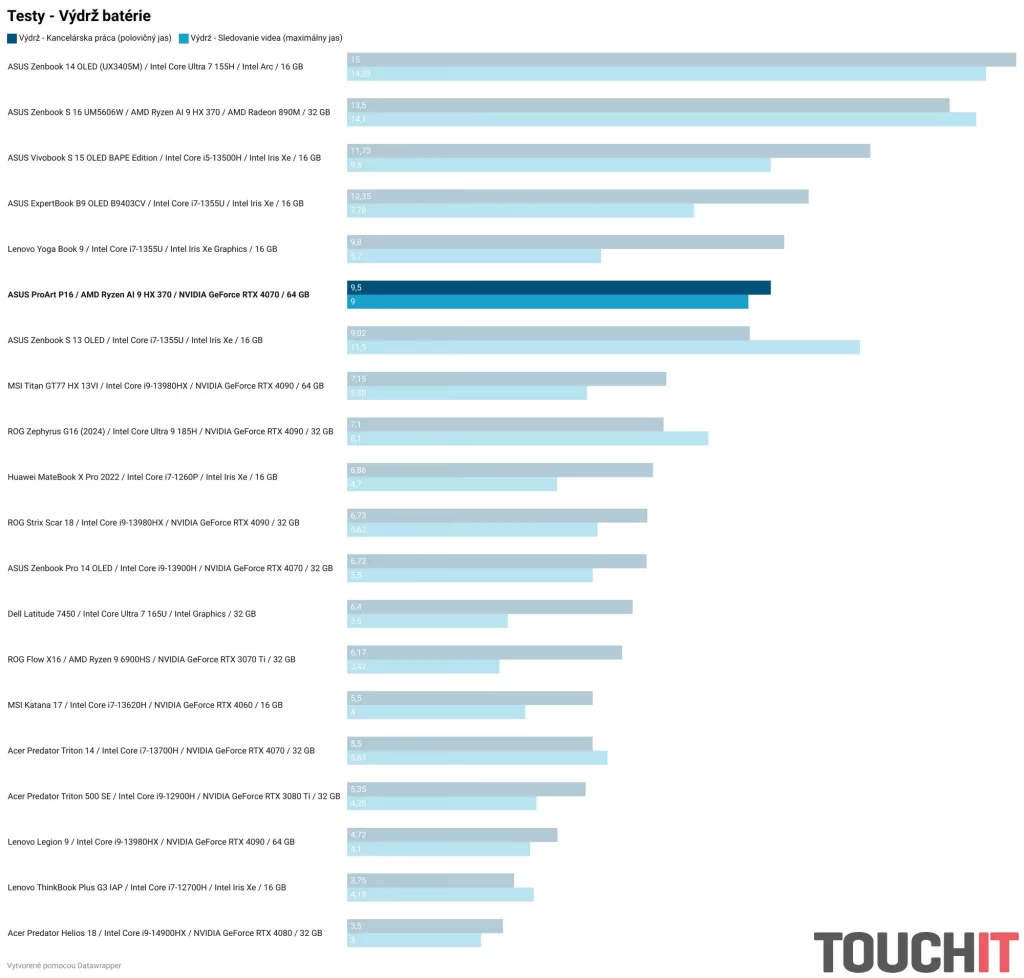 Ryzen AI 9 HX 370 poteší výkonom aj výdržou batérie. Výdrž nie je taká dobrá ako v prípade Zenbooku S 16, avšak takmer 10 hodín sledovania videa a práce je v segmente výkonných notebookov pre tvorcov obsahu dobrý výsledok. V reálnych podmienkach odhadujem výdrž na 6 až 8 hodín práce v závislosti od toho, čo s notebookom robím.