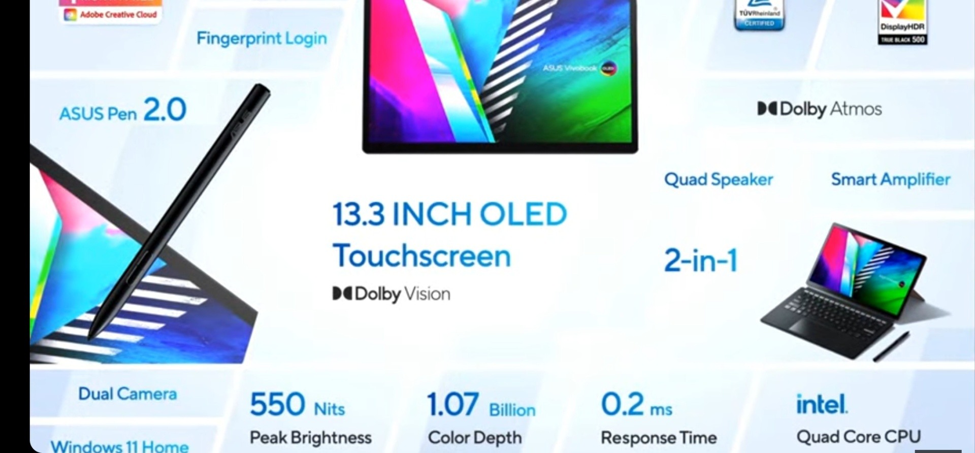 ASUS predstavil na on-line tlačovke zariadenie, ktoré kombinuje dva svety – notebook a tablet, oba s operačným systémom Microsoft Windows. Hlavnou výhodou je 13.3-palcový displej typu OLED, ktorý môžete využiť aj ako váš osobný televízor. Ide o dotykový displej s pomerom strán 16:9 a s podporou Dolby Vision PANTONE. Udávaný kontrast je až 1 000 000 : 1, tento displej na len 0,2-milisekundovú odozvu a čo je pre používateľa obzvlášť dôležité, vyžaruje o 70 % menej modrého svetla ako LCD displeje. Nebudú vás tak bolieť oči ani pri jeho dlhodobom sledovaní.