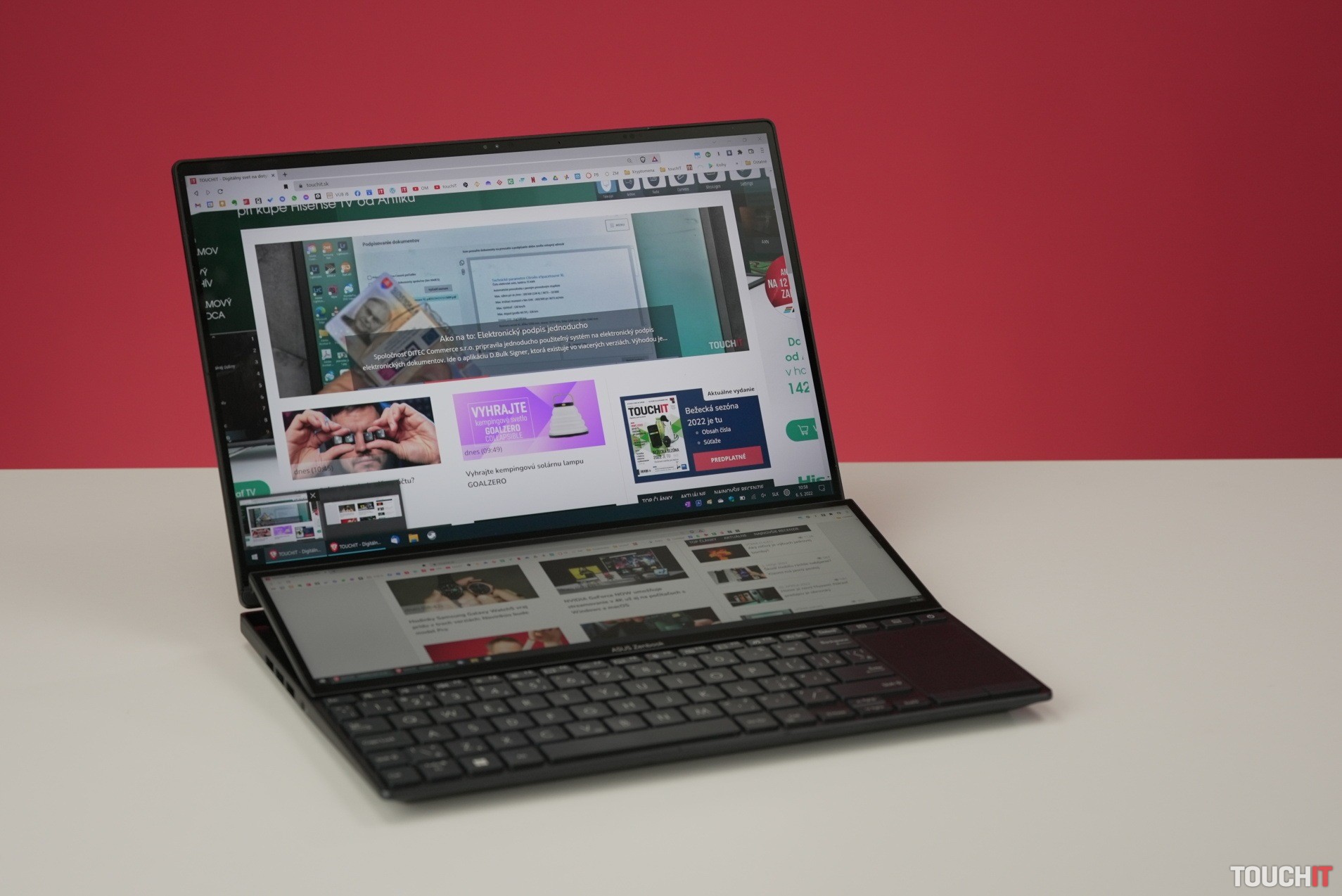Je to poznať na prvý pohľad a s týmto notebookom sa treba naučiť pracovať. Tým, že výrobca pridal druhý displej nad klávesnicu, nezostalo miesto na ruky. Namiesto opierky pod klávesnicou teraz budete používať stôl. To ale znamená, že budete mať notebook o približne 10 cm ďalej, najmä displej.