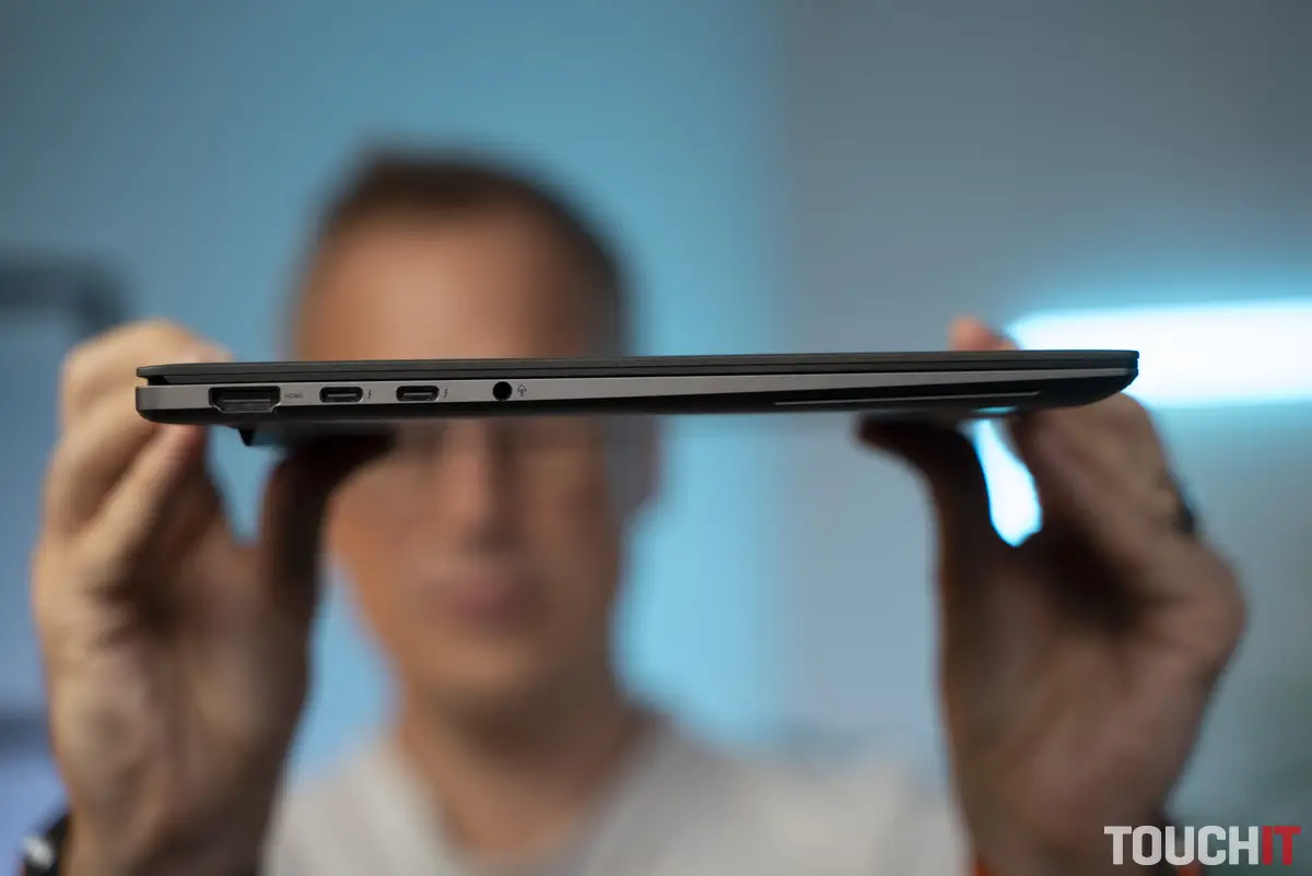 Nad klávesnicou sa nachádza mriežka, ktorá umožňuje efektívnejšie chladenie procesora a komponentov. Portová výbava je štandardná – dva USB-C porty s Thunderbolt 4, jeden USB-A 3.2 Gen2 port, HDMI 2.1 výstup a 3,5 mm jack.