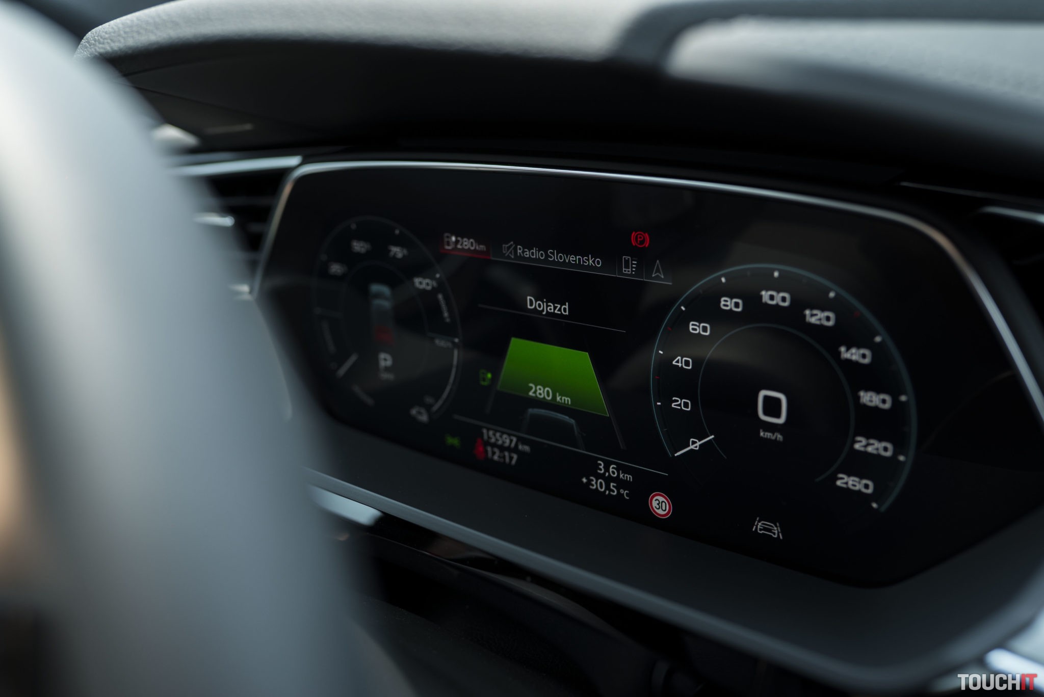 e-tron má neuveriteľné zrýchlenie a takmer celkom tichý pohon. Možno oceníte aj to, že jazdíte s nulovými emisiami CO2. Výrobca udáva teoretický dojazd na plne nabitú batériu na hodnote až 411 km (podľa WLTP, režim eco, 20-palcové kolesá, mesto, 30°C, bez klimatizácie) , ale v praxi sa k tomu skôr nedostanete. Človek, čo si kúpi e-tron predsa nebude jazdiť pri okolitej teplote 30°C s vypnutou klimatizáciou a ani nebude používať režim eco.