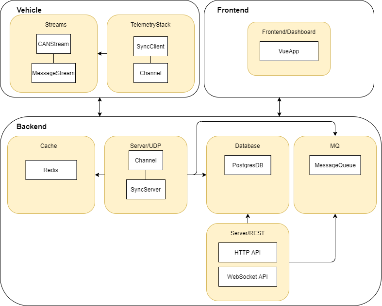 Cieľom nášho projektu bola implementácia dátovo efektívneho zberu dát v reálnom čase, webového rozhrania a spoľahlivého ovládania vozidla na diaľku. Pri zbere dát sa sústreďujeme na dáta zo zberníc vozidla, kde každý údaj môže prúdiť s iným intervalom a je potrebná synchronizácia. Naše riešenie umožňuje aj tzv. virtuálne polia, teda také, ktoré nepochádzajú z reálnej zbernice, ale iného vstupu definovaného používateľom. Neoddeliteľnou súčasťou telemetrie je tiež dátový tok, keďže pripojenie nie je vždy stabilné a v odľahlých oblastiach kde je slabý signál je často len EDGE pripojenie. Pre tieto účely sme vyvinuli vlastný synchronizačný protokol podporujúci ako spoľahlivý, tak aj nespoľahlivý prenos, detekciu výpadku spojenia, hand-over v prípade pripojenia na lepší uzol a reprezentáciu celého stavu vozidla v jednej synchronizácií. Priemerná šírka pásma, ktorú sme pri testovaní zaznamenali bola 27 kbps, teda 1 hodina jazdenia vyžaduje iba 11 MB dát. Používateľovi naše rozhranie umožňuje sledovať stav vozidla v reálnom čase ako jazdí, alebo si spätne prehrať záznamy z minulosti a poprípade si k nim vyrobiť grafy. Taktiež má používateľ si celý záznam exportovať ako CSV a analyzovať ho v inom programe ako napr. Excel. Používateľ si môže definovať aj vlastné dátové transformácie ako jednoduché funkcie v prípade, že sledované pole zo zbernice nie je jedno z preddefinovaných.