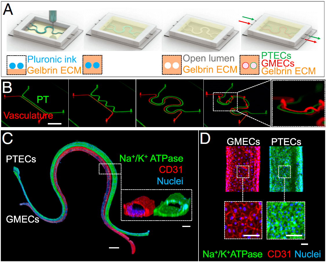 Na tieto pokusy sa harvardskému tímu podarilo nadviazať v roku 2019 (číslo vedeckej publikácie DOI: 10.1073/pnas.1815208116) vytlačením viacerých tubulov spolu s jednoduchým cievnym systémom, pričom sa pozorovala ich vzájomná interakcia. Toto použitie rôznych buniek a viacnásobných prvkov v rámci jedného tkaniva nás posunulo znova o malý krok bližšie k potenciálnej stavbe, respektíve tlači nefrónu.
