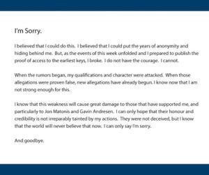 Po tomto šokujúcom súkromnom odhalení Gavinovi sa Craig Wright o pár dní neskôr odhalil takisto verejnosti, a to vskutku pompézne. Vo svojom príspevku na blogu vysvetlil najprv niekoľko princípov, na ktorých bitcoin a šifrovanie funguje a následne podpísal ukážkový text kryptografickým kľúčom, ktorý vlastní len ozajstný Satoši Nakamoto. Bolo hotovo. Identita tajomného tvorcu bitcoinu bola odhalená a definitívne potvrdená.
