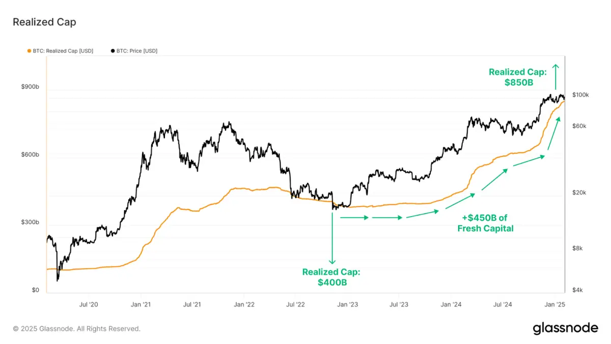 Od medvedieho trhu v roku 2022 Bitcoin zaznamenal výrazný nárast nových investícií o viac ako 500 miliárd dolárov. Prílev čerstvého kapitálu viedol k prekonaniu predchádzajúcich rekordov v realizovanej trhovej kapitalizácii. Tento ukazovateľ sleduje hodnotu každej kryptomeny na základe poslednej blockchainovej transakcie.