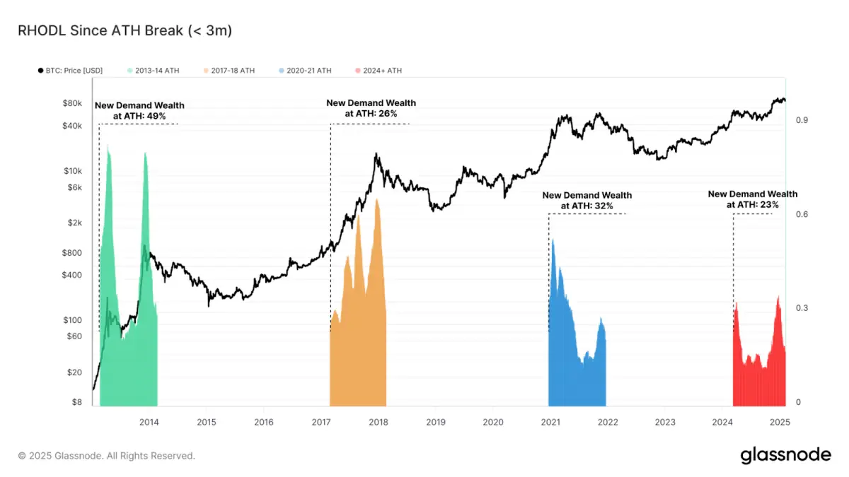 Aktuálne je však presun tohto kapitálu v menšom množstve, čo značí, že nové investície prichádzajú v krátkych „nárazových“ vlnách. Navyše cenové vrcholy sa v predošlých cykloch formovali asi rok po prekonaní historických maxím.