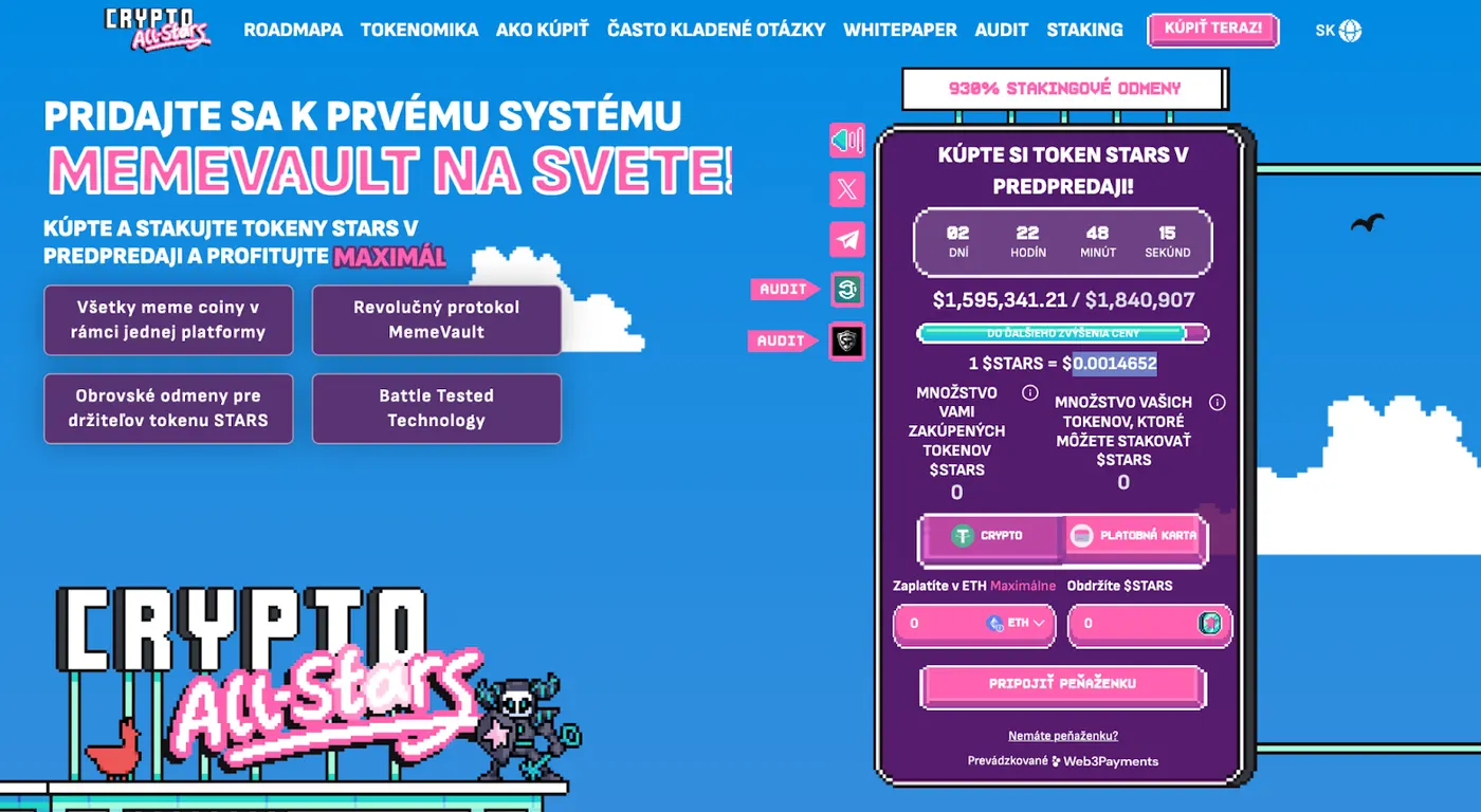 Atraktívnou funkciou MemeVaultu sú tiež trojnásobné odmeny za staking. Táto ponuka je k dispozícii po zakúpení natívnych tokenov STARS, ktorých predpredaj odštartoval tento mesiac. Tokeny si môžete zakúpiť za 0,0014652 $ a to pripojením kryptopeňaženky k nákupnému widgetu na oficiálnej stránke projektu.