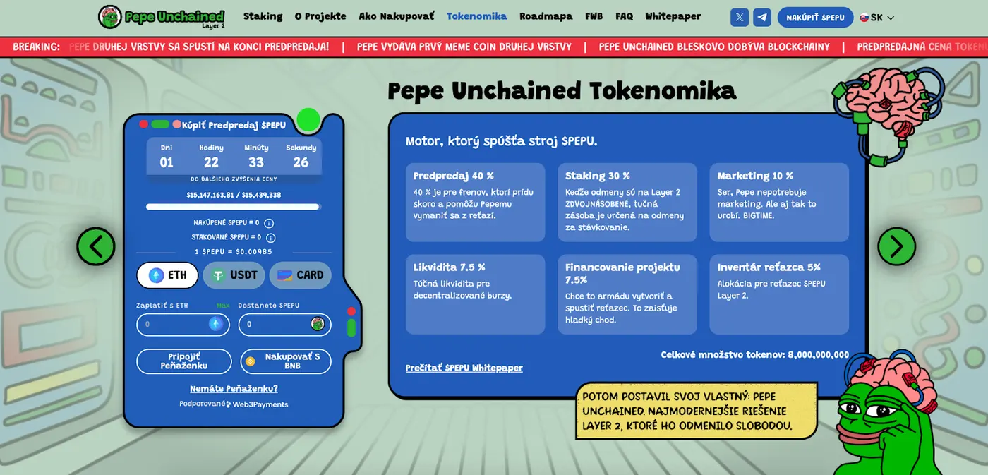 Prvým perspektívnym projektom je Pepe Unchained. Natívny coin PEPU prichádza s blokchainovým riešením, ktorého cieľom je umožniť kryptoobchodníkom rýchlejšie a lacnejšie transakcie.