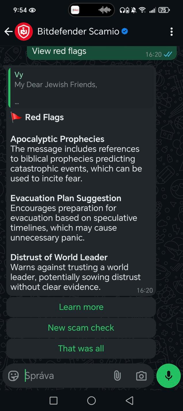 Bezpečnostná firma Bitdefender, ktorá má v ponuke aj antivírusové riešenia, má teraz špecializovaný doplnok Bitdefender Scamio integrovaný priamo do tohto komunikačného nástroja. V rozhraní WhatsApp sa môžete umelej inteligencie opýtať, či je správa, ktorú ste dostali, podvodom. Dozviete sa, aké má podozrivé znaky alebo či obsahuje rizikové faktory.